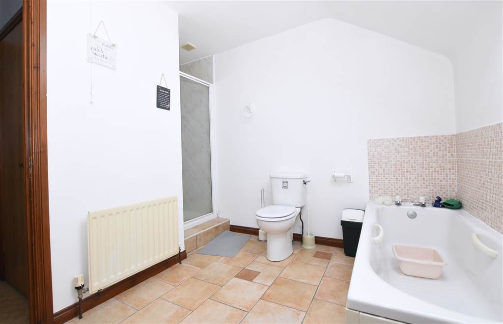 Large bathroom with the suite in white with bath, wc, wash hand basin on a pedestal and the shower is in a separate cubicle. There is a tiled floor and partially tiled walls with mosaic tiles.