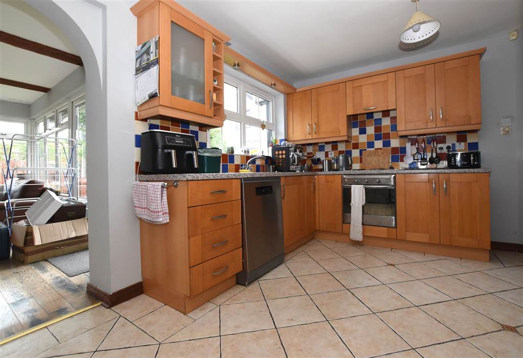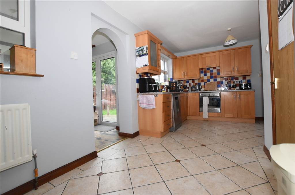 Kitchen with a selection of high and low level units, partially tiled walls, tiled floor, one and a half stainless steel sink with drainer and mixer tap, spotlights over the window, integrated oven and hob with extractor fan, plumbing for dishwasher and archway through to the sun room. There is also room for a dining table and chairs.