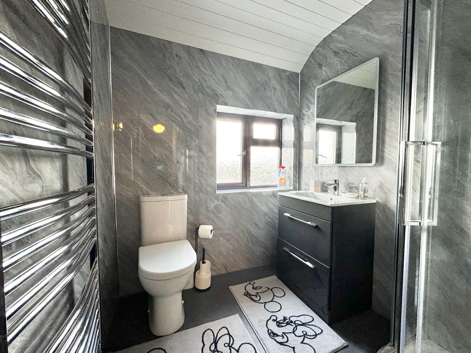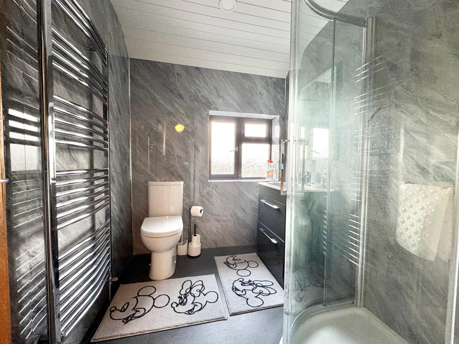 Three piece white suite. Large corner shower. Sink in vanity unit. Chrome heated towel rail. Recessed lighting. Touch mirror light. PVC panelled walls. Tiled splashback. Laminate flooring.