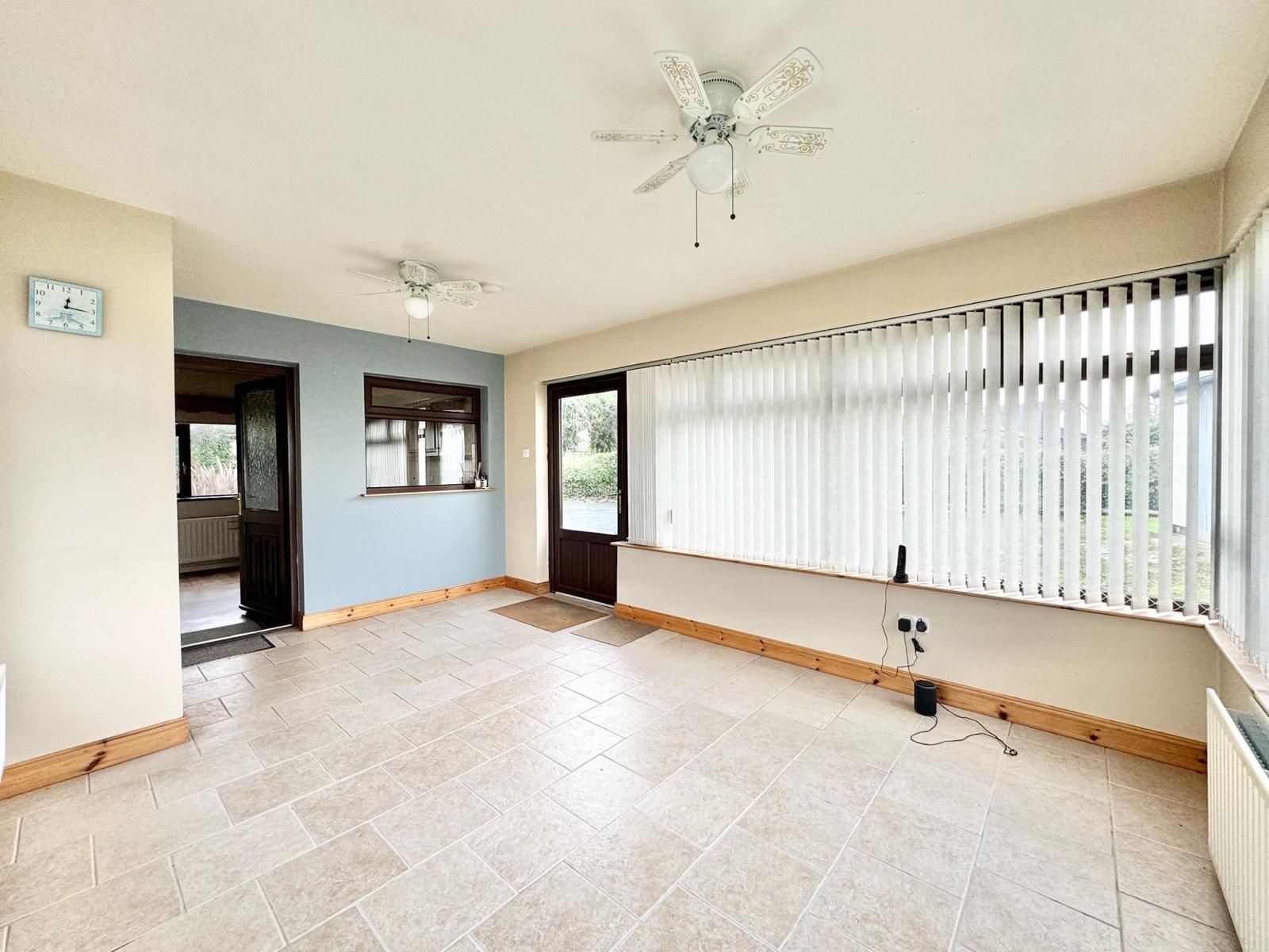 Ceiling fan lights. Cloakspace off. Tile flooring.