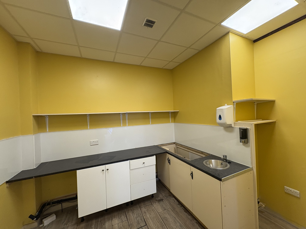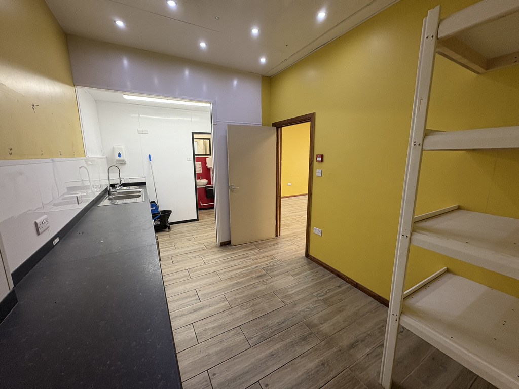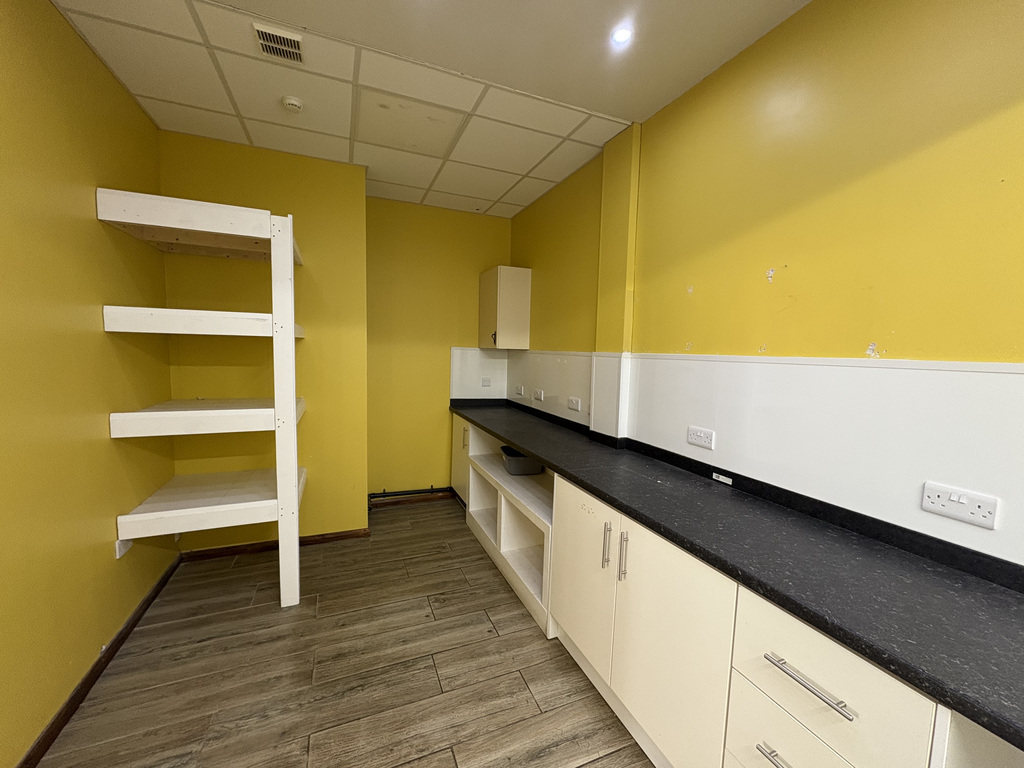The unit is open plan throughout, with a staff/prep kitchen to the rear, including a range of fitted units and a toilet. The flooring throughout is tiled with wood affect and the ceiling is suspended with LED lighting.