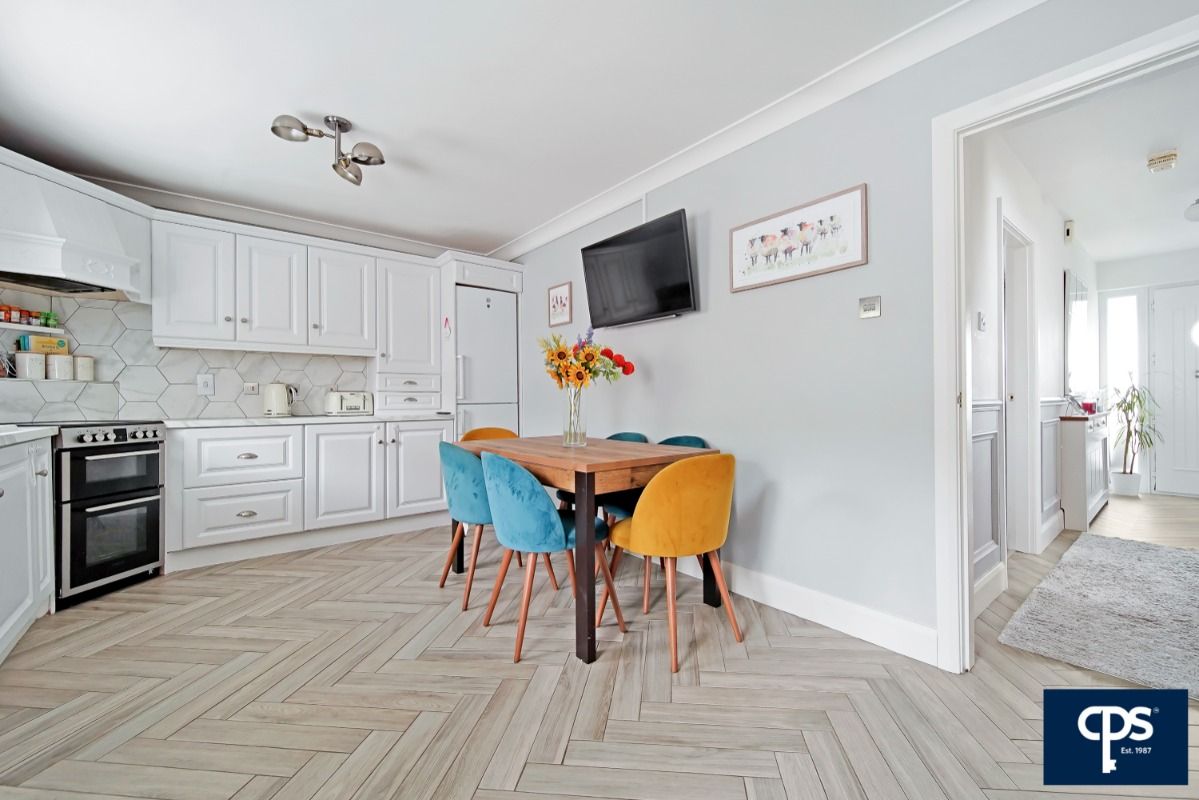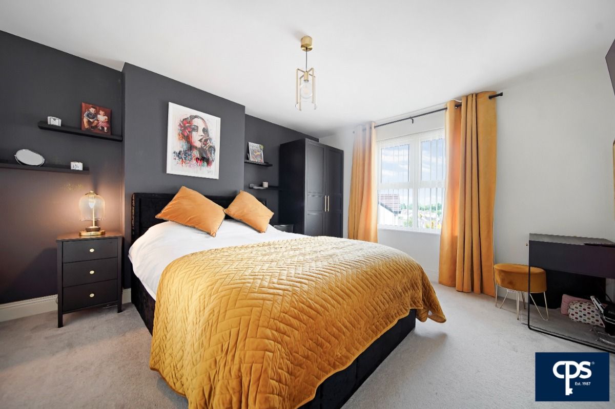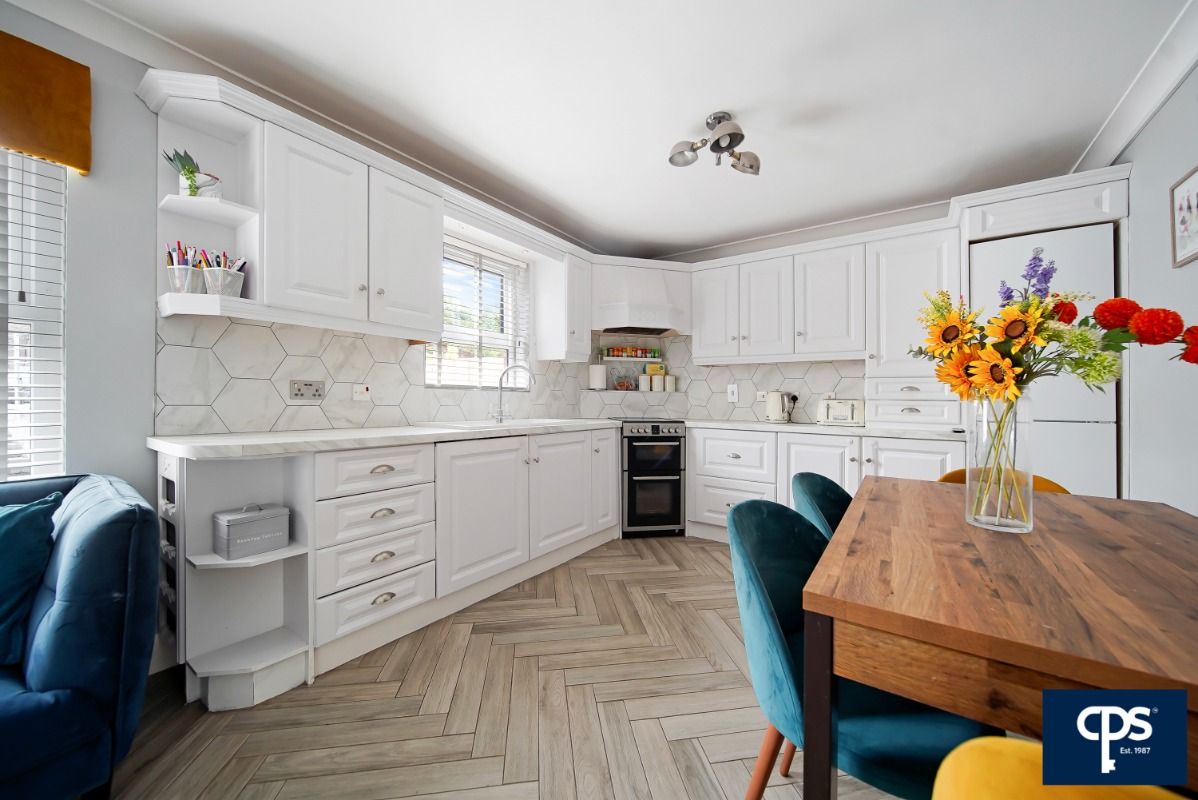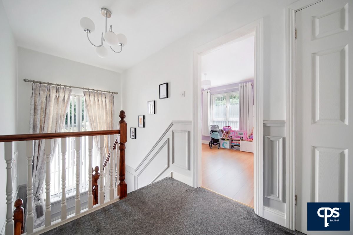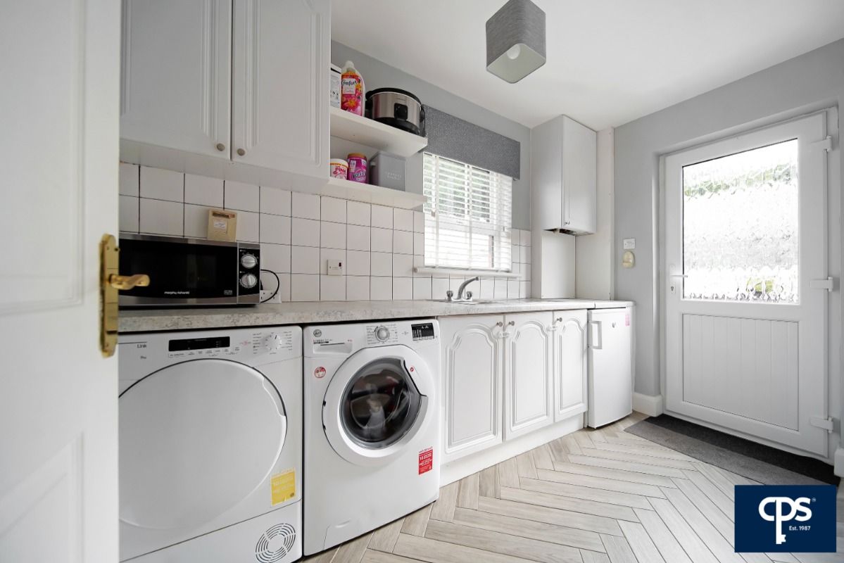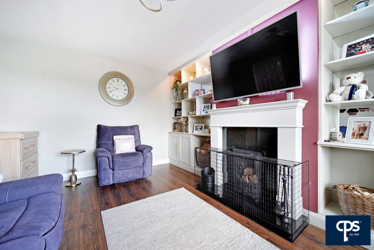 Internally, the property boasts stylish décor throughout, with feature wall panelling in key areas that add a touch of modern elegance. This home is further enhanced with the open-plan kitchen and dining area, which is complemented by a separate utility room for added practicality. The spacious living room features a striking centrepiece fireplace and bespoke shelving, creating a warm and inviting space. The ground floor is complete with a contemporary ground floor W.C. which adds convenience for guests and family alike.