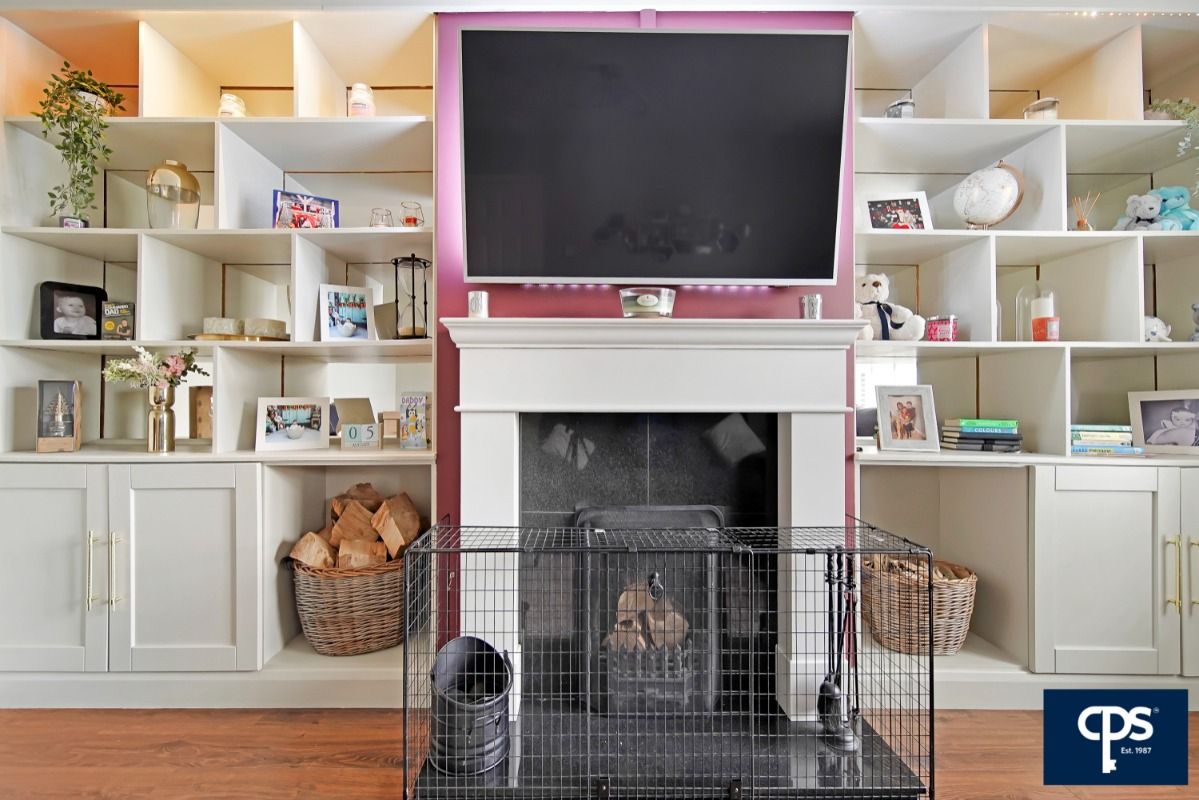 Spacious family living room with feature fireplace, open fire and bespoke shelving. Complete with wooden flooring.