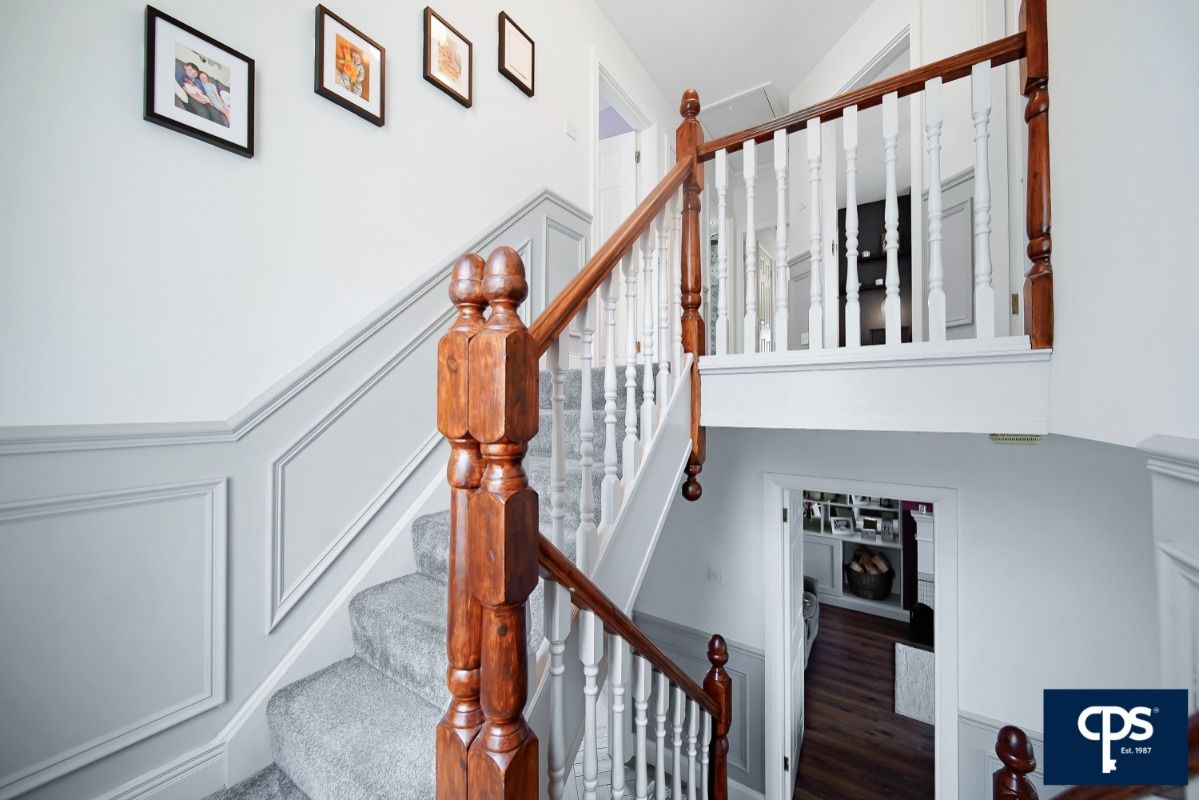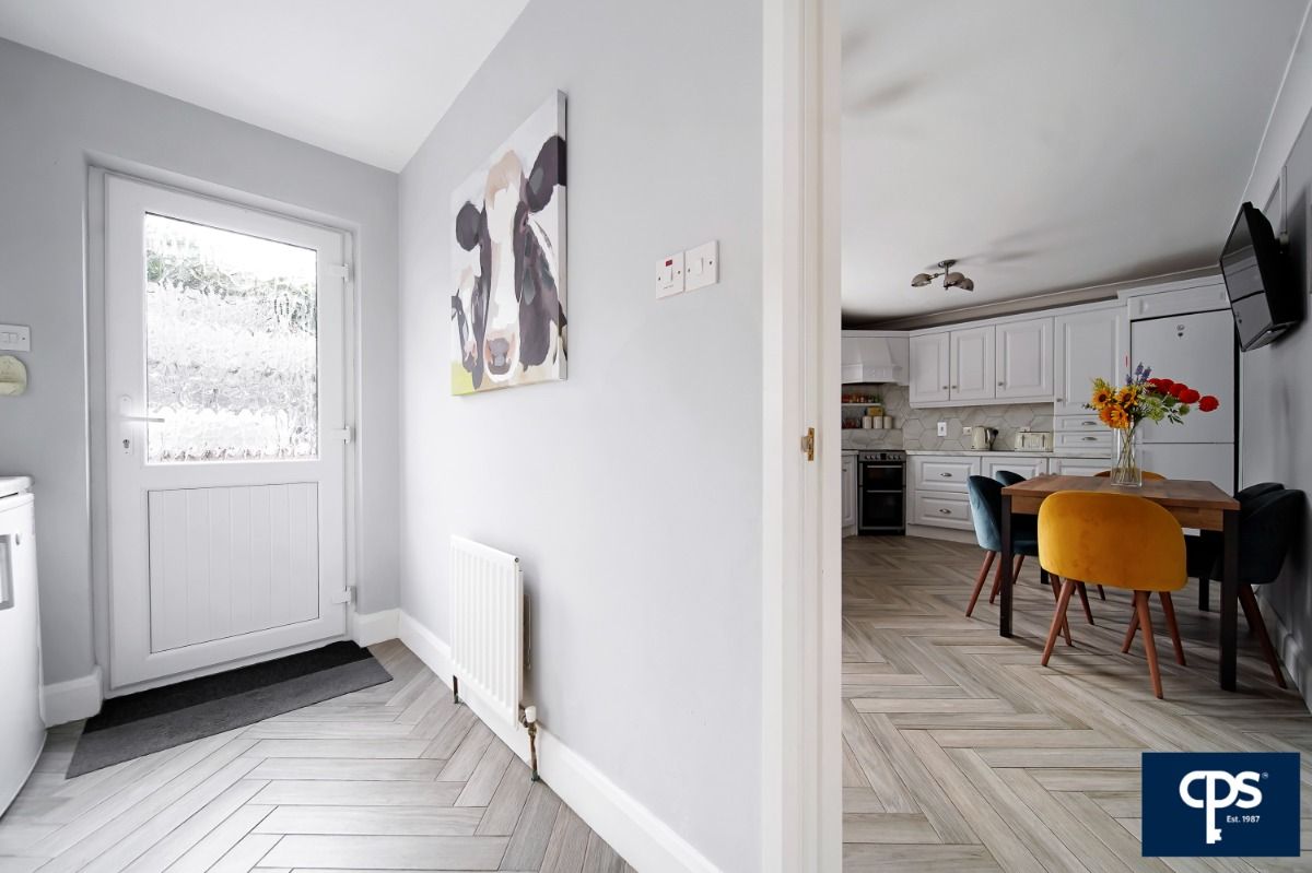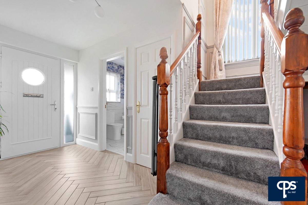 Spacious entrance hall with stunning décor to include wall panelling and herringbone wood effect tile flooring. Stairwell to first floor with ample understairs storage.