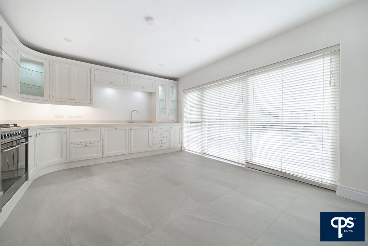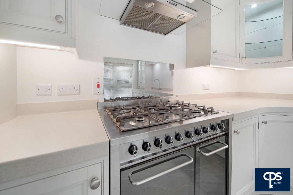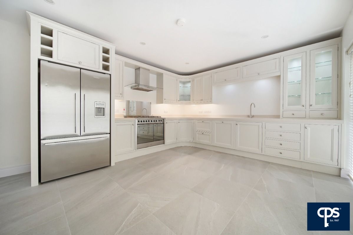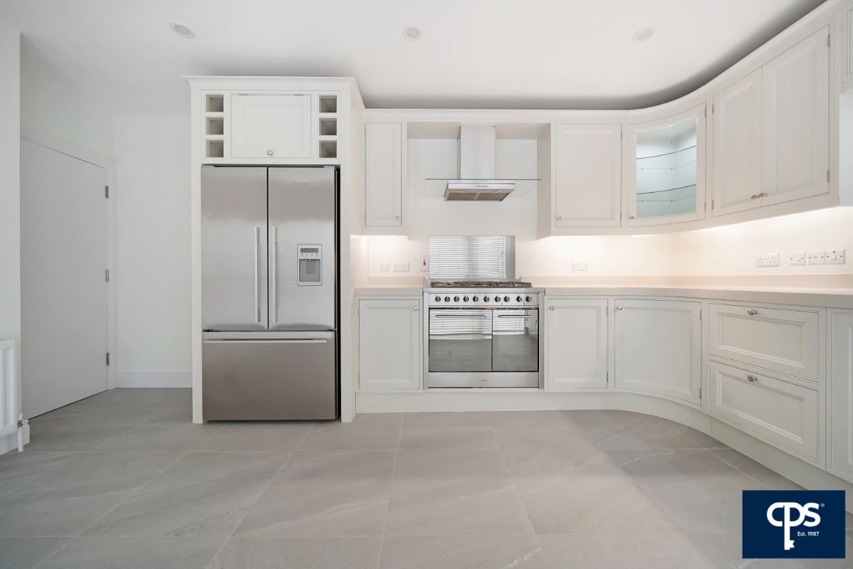 Bright and modern kitchen filled with natural light, featuring a superb range of high and low-level units, electric oven, gas hob, extractor fan, American-style fridge freezer, and integrated dishwasher. Finished with tiled flooring and under-cupboard lighting. Sliding doors leading to the outdoors.