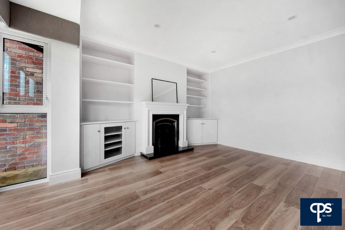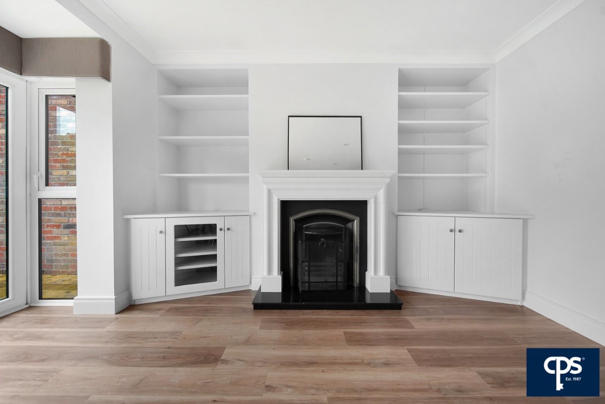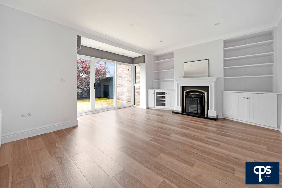 Spacious family living room filled with natural light boasting a stunning feature fireplace and open fire, built-in units on either side of the chimney, and sliding doors opening to rear decking. Finished with stylish wooden flooring.