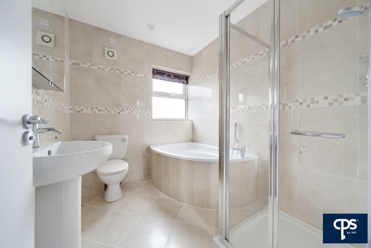 Fully tiled bathroom featuring a corner shower, separate corner bath, toilet, and basin with pedestal.