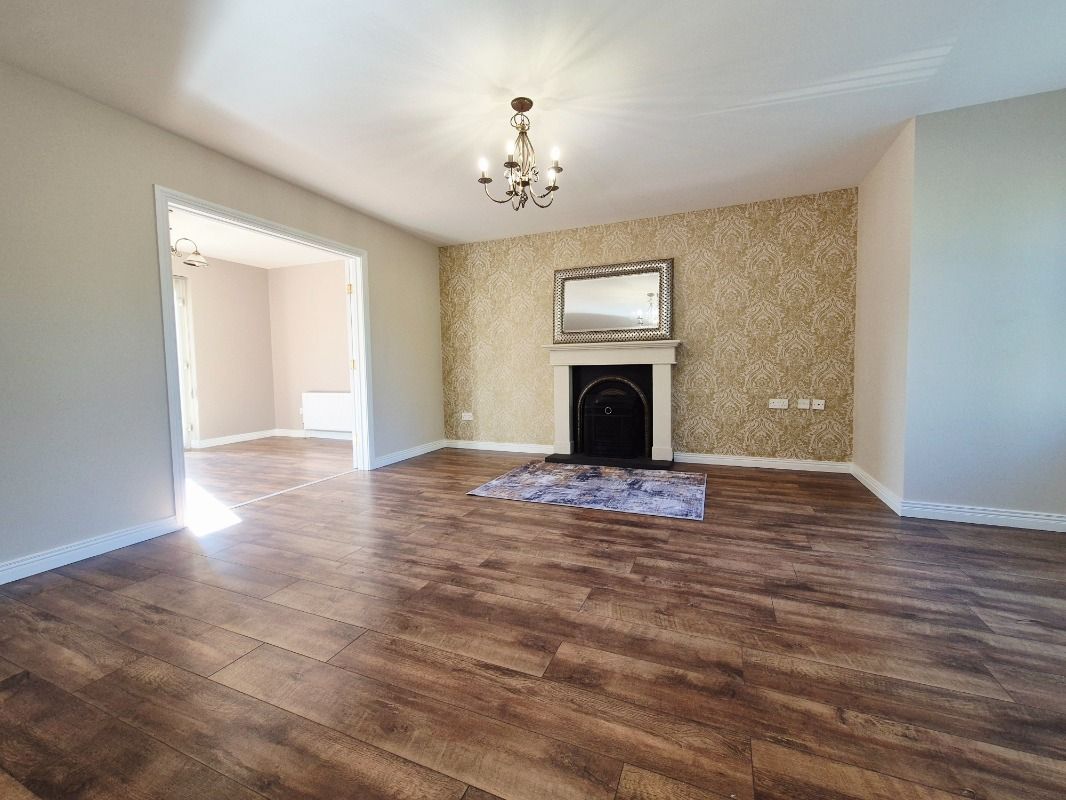 The spacious living room boasts a feature fireplace with an open fire, and wooden flooring throughout. Double French doors lead into the dining area, creating a seamless flow for family living.