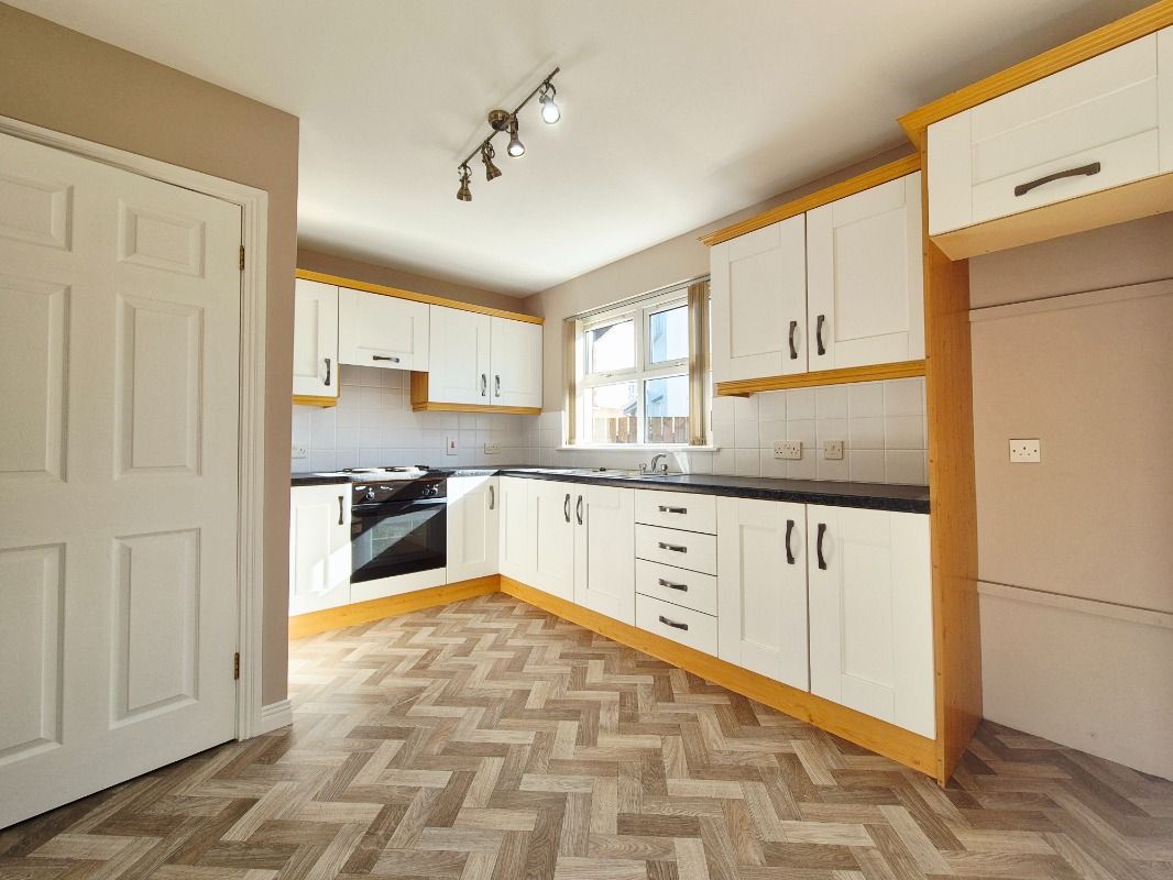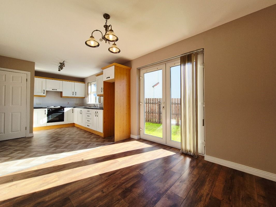 A generous open-plan kitchen/dining area featuring high and low-level units, an integrated electric oven, hobs, and extractor fan. A stainless steel sink and drainer complete the kitchen, while the dining area boasts wooden flooring and double patio doors opening directly to the rear garden.