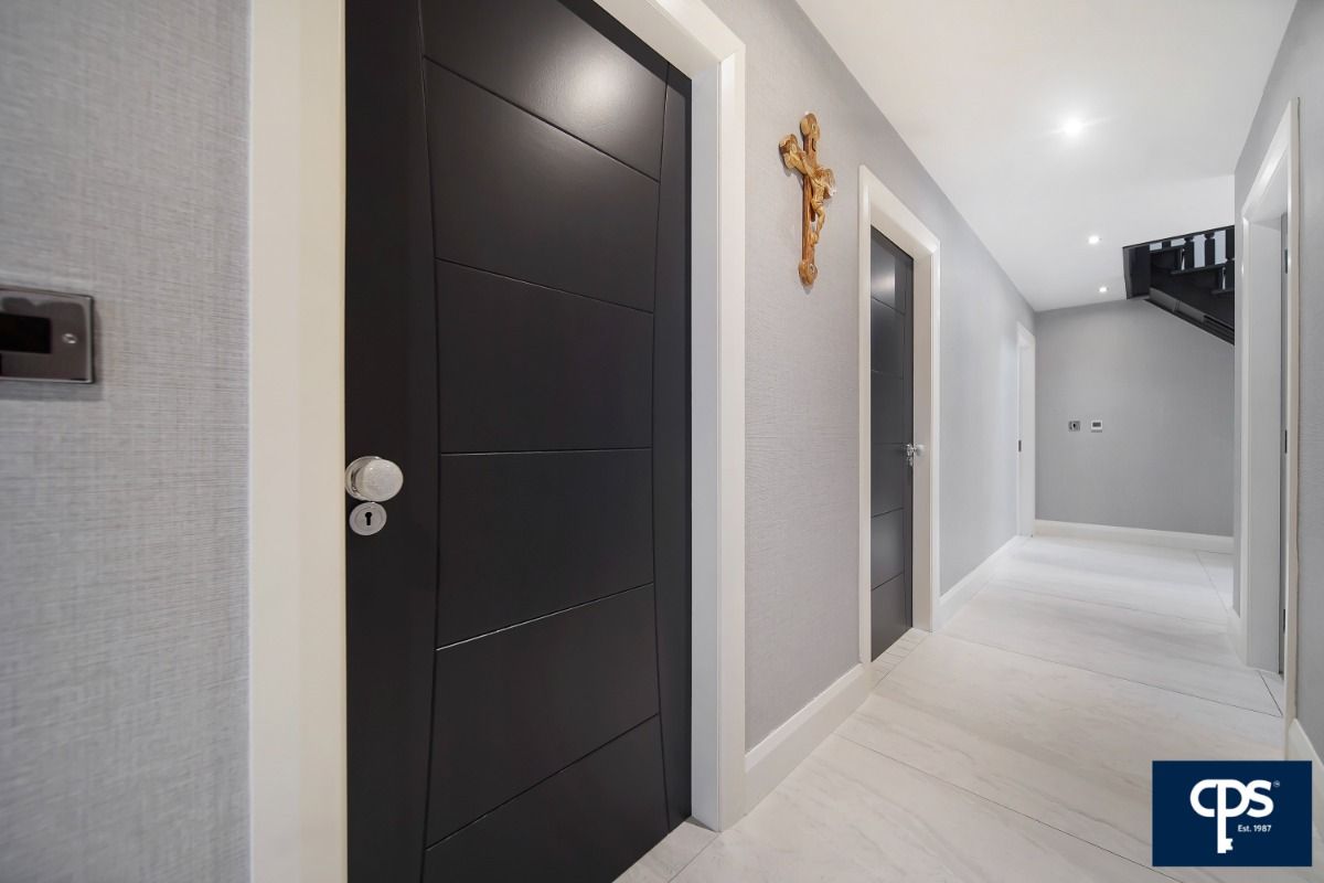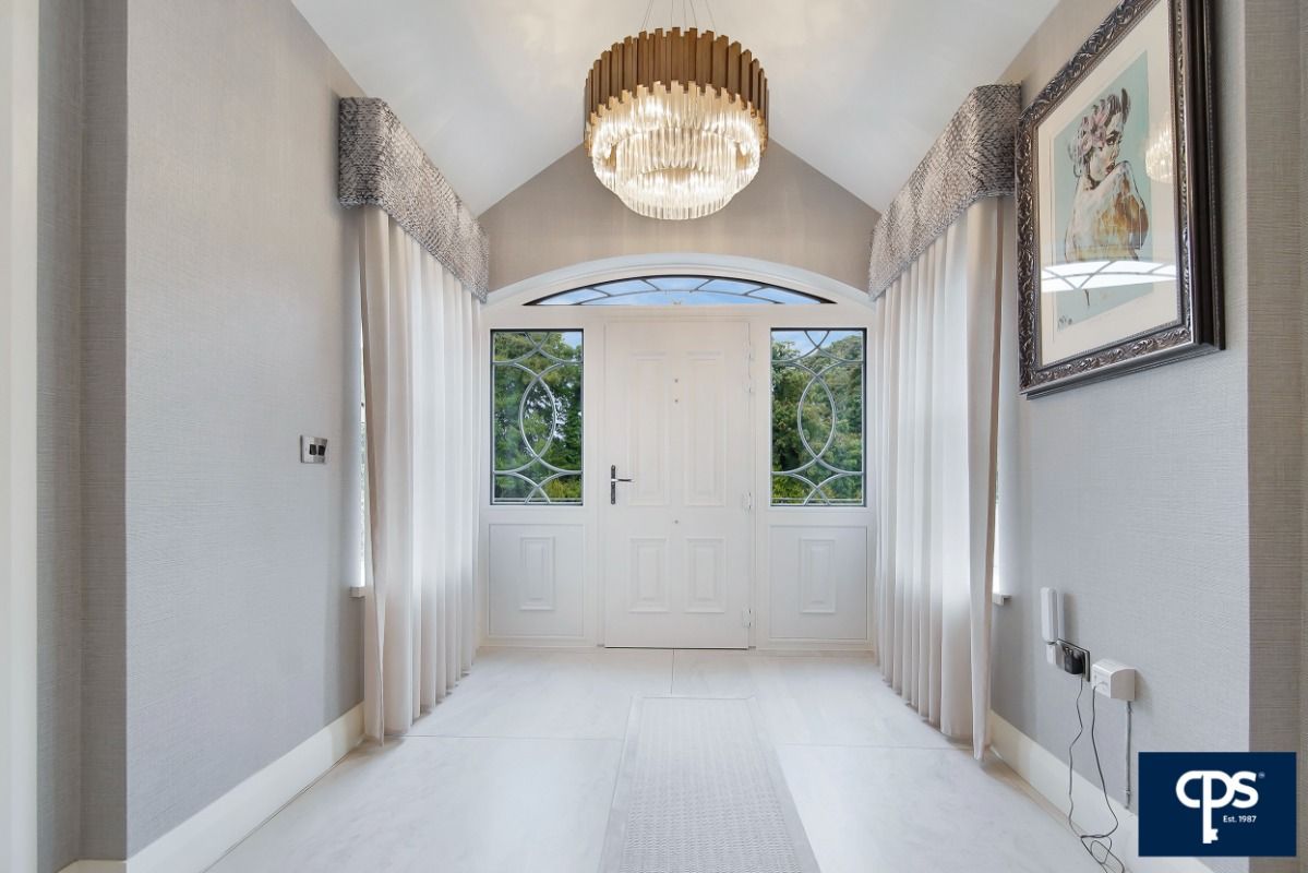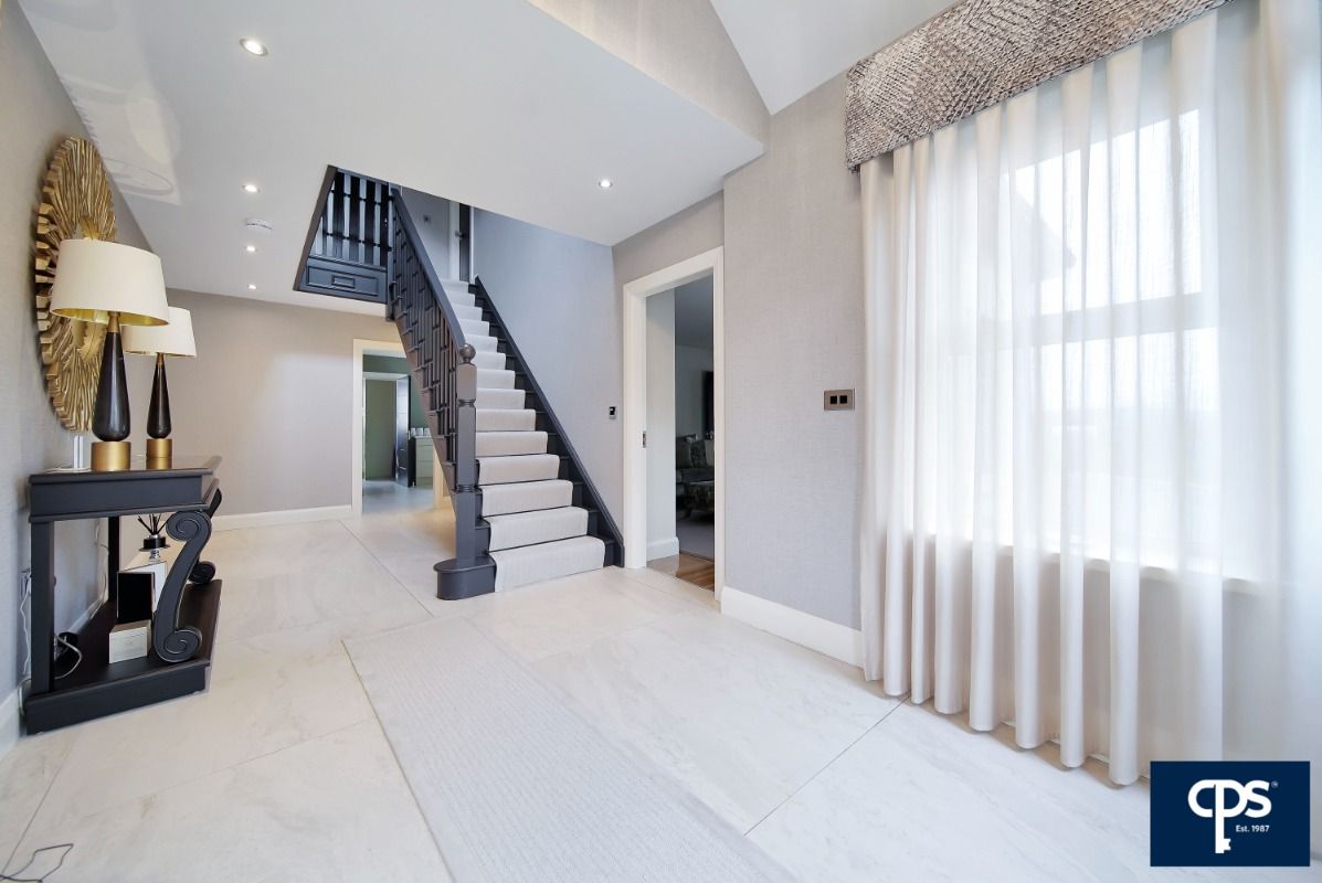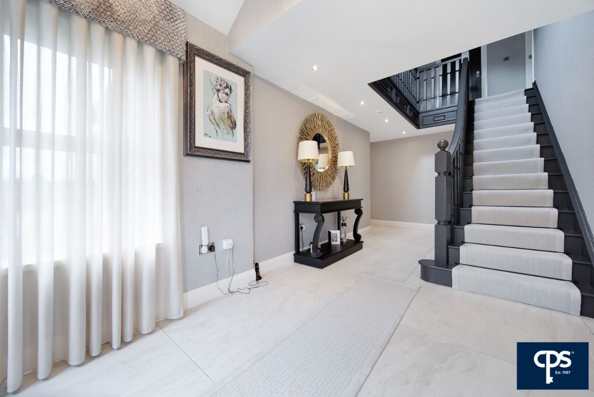 A bright, welcoming hallway with tiled flooring and staircase to the first floor. Flooded with natural light, setting a stylish tone for the home.