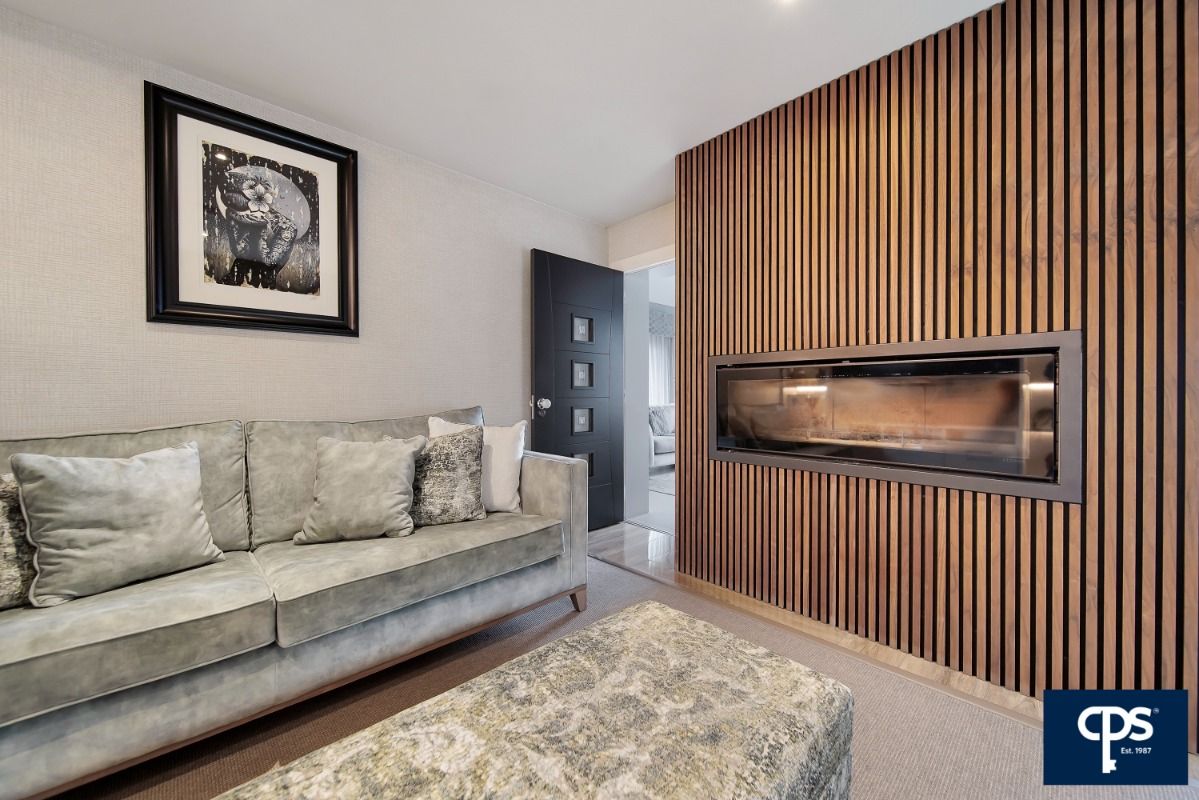 A cosy yet stylish living area featuring a custom media wall, wood-effect tiled flooring, and a built-in stove axe fire for warmth and character.