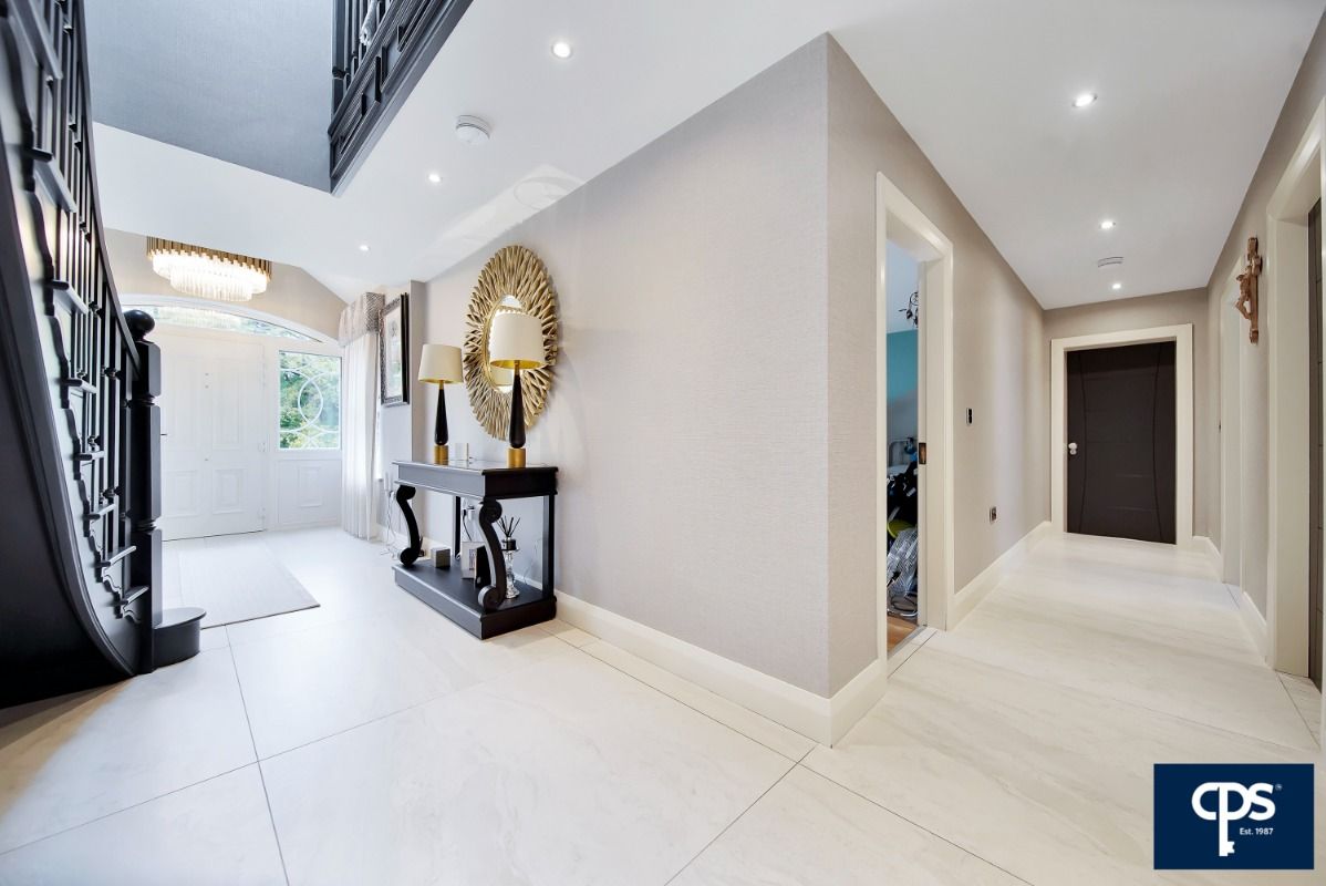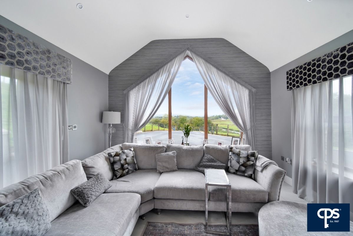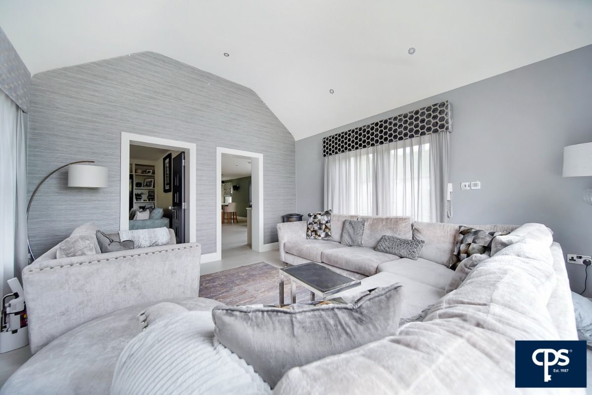 This impressive property combines elegant modern design with practical family living. The spacious open-plan kitchen, dining, and sunroom area is perfect for entertaining and family life, while the main sitting room offers a cosy retreat with its inset stove and feature media wall.