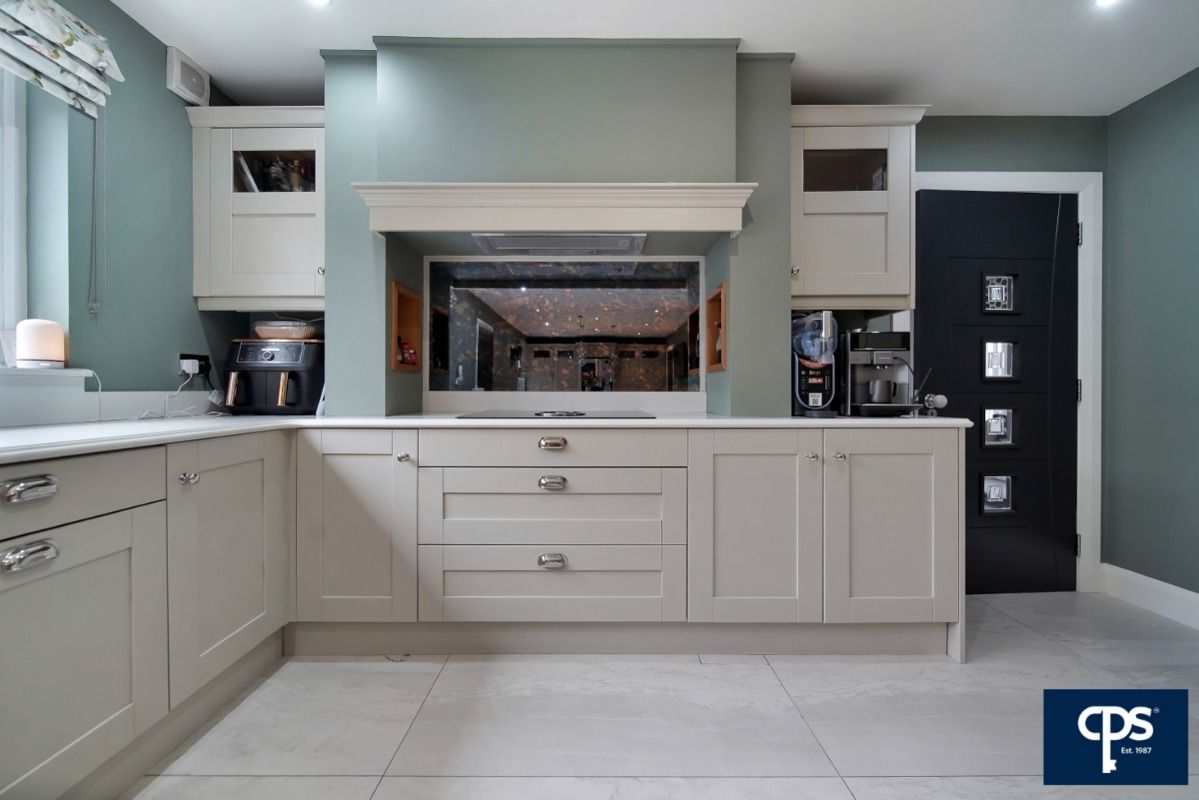A stunning open-plan kitchen and dining space featuring a full range of high and low-level cabinetry with sleek porcelain tiling throughout.