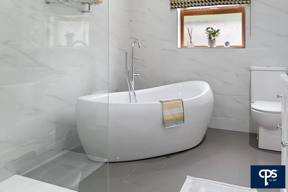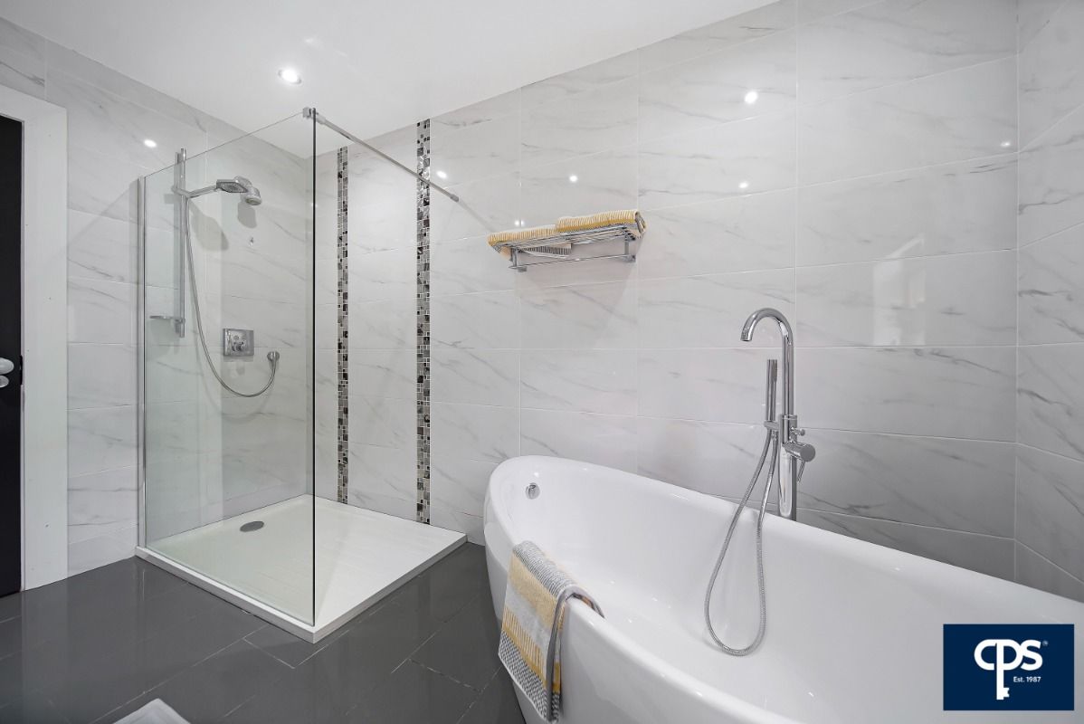 Luxurious white suite including toilet, basin with vanity unit, freestanding bath, and power shower. Finished with floor-to-ceiling wall tiling for a modern touch.