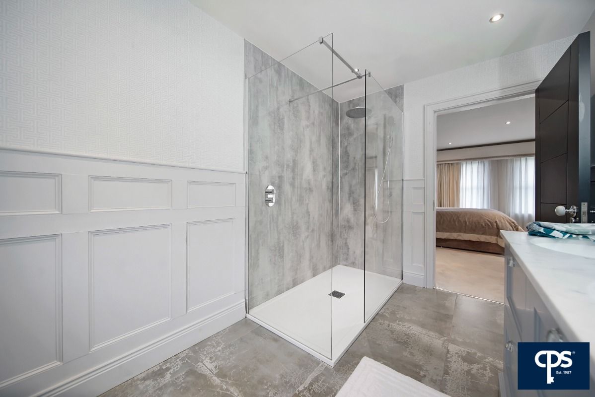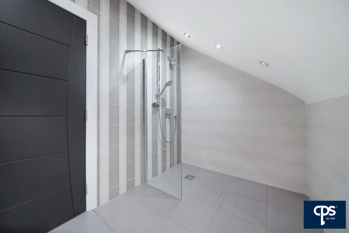 Features a his & hers vanity unit, power shower, toilet, tiled flooring, and decorative wall panelling.