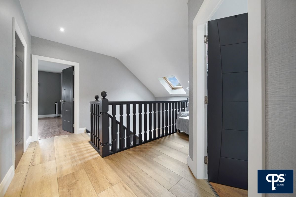 The ground floor includes a luxurious master suite with walk-in wardrobe and en-suite, along with a second double bedroom and a stylish family bathroom. Upstairs, there are three excellent bedrooms, a modern shower room, and a hot press.