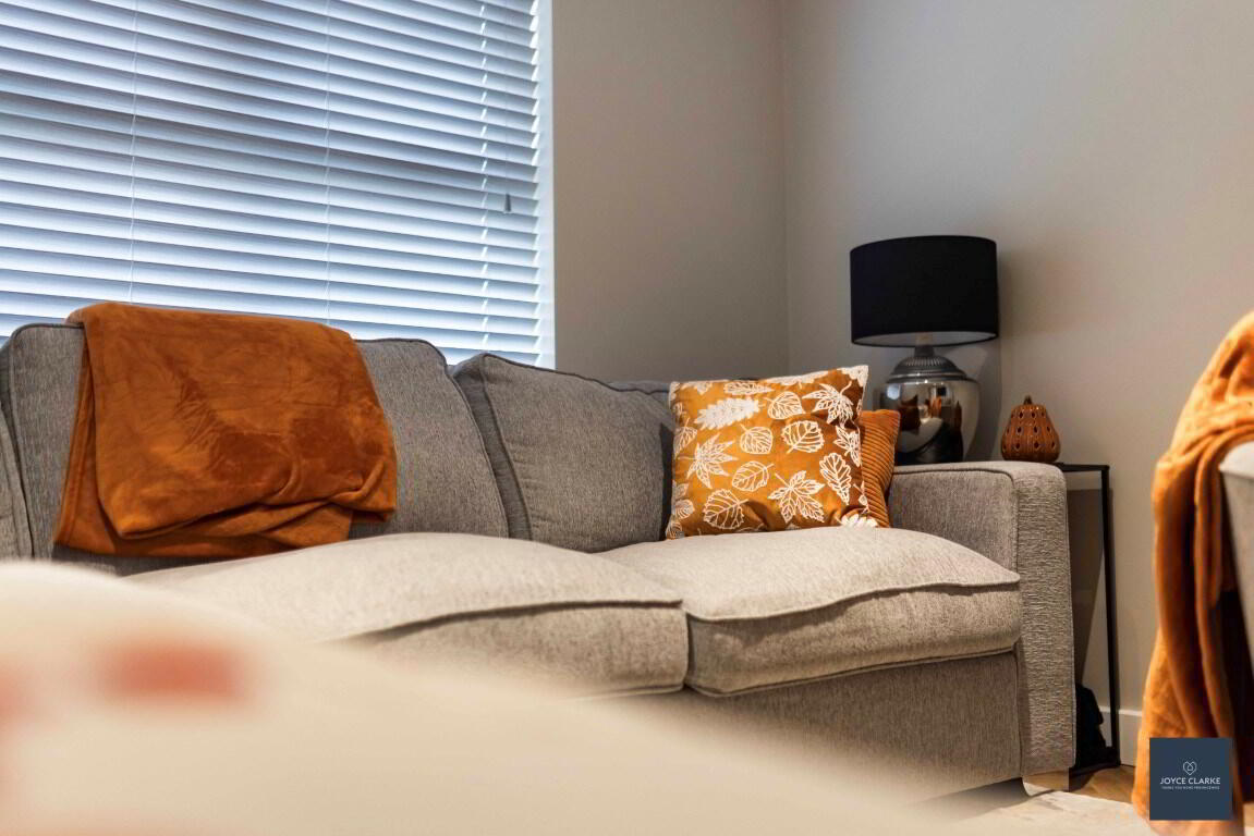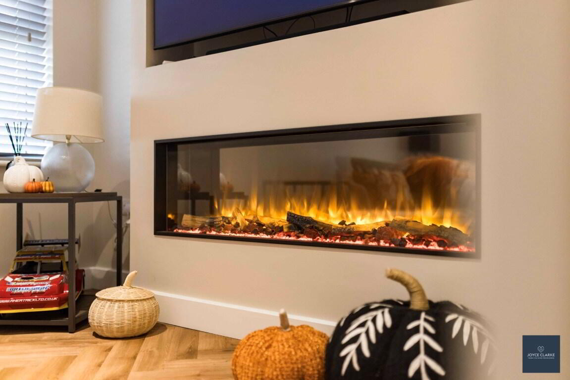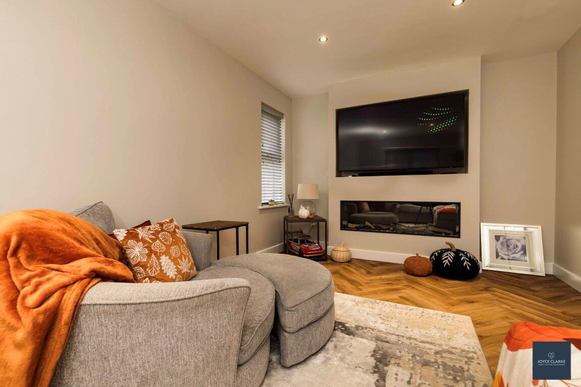 Dual aspect reception room with feature media wall including electric fire, TV point and Internet points. Additional TV. Double panel radiator. Recessed lighting. Wood effect herringbone style LVT flooring.