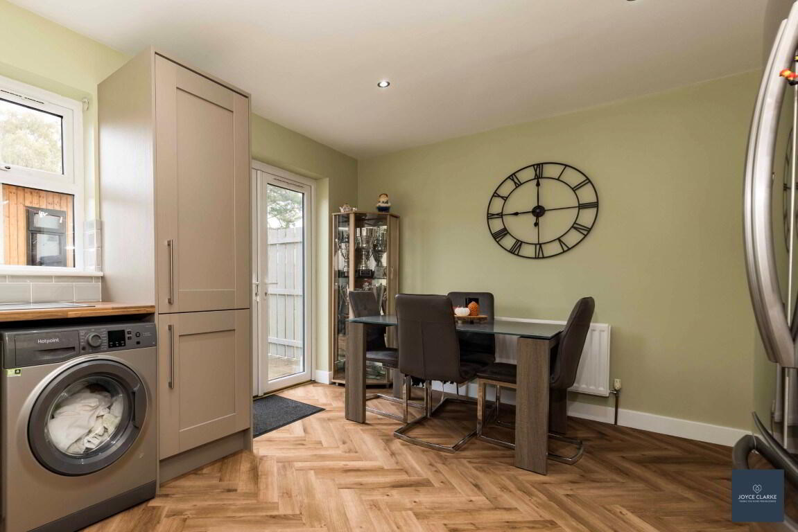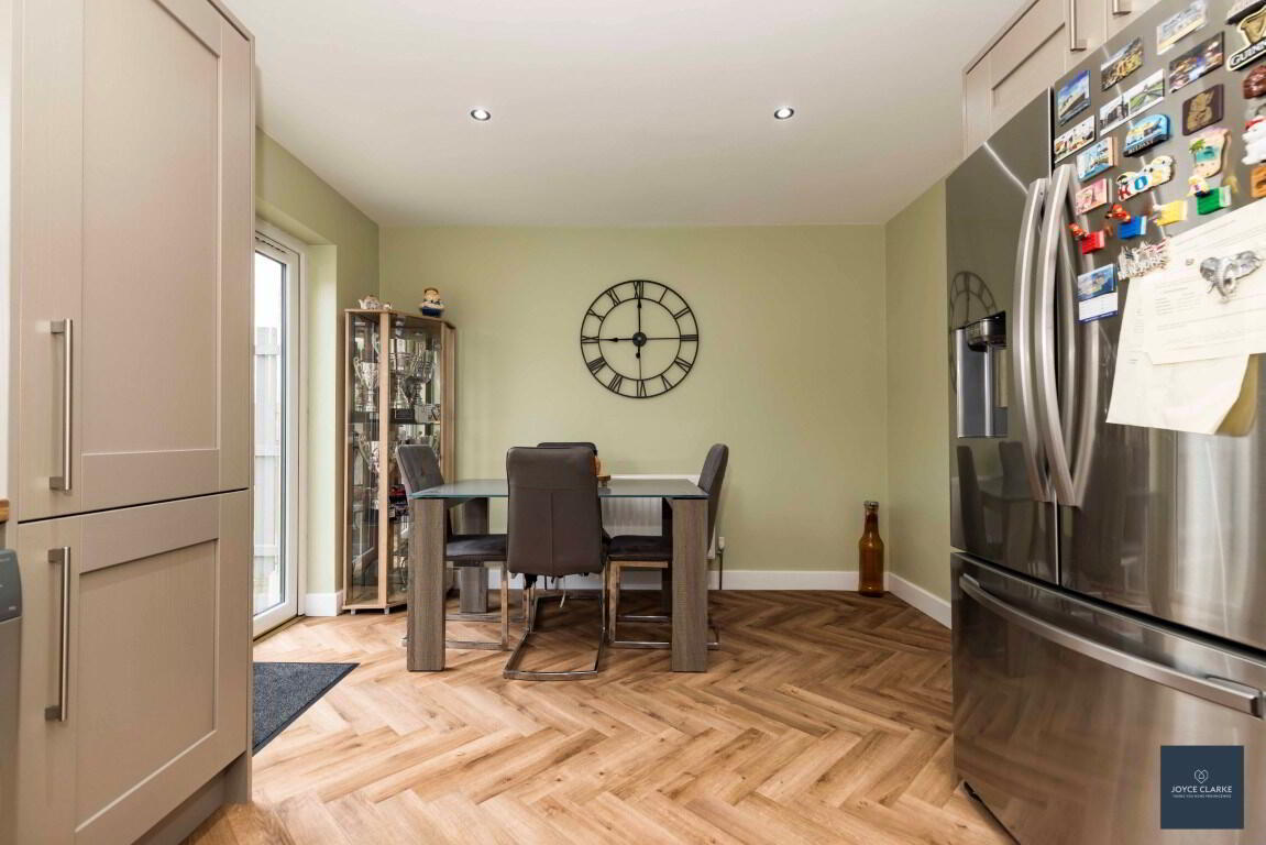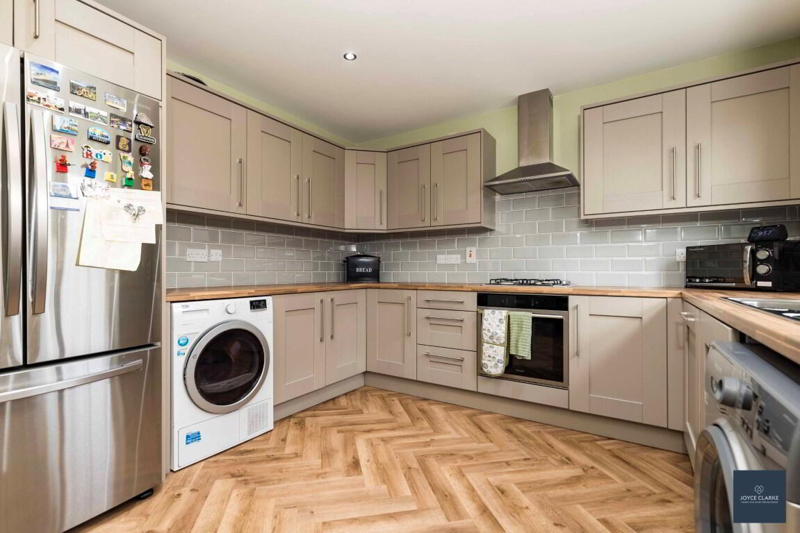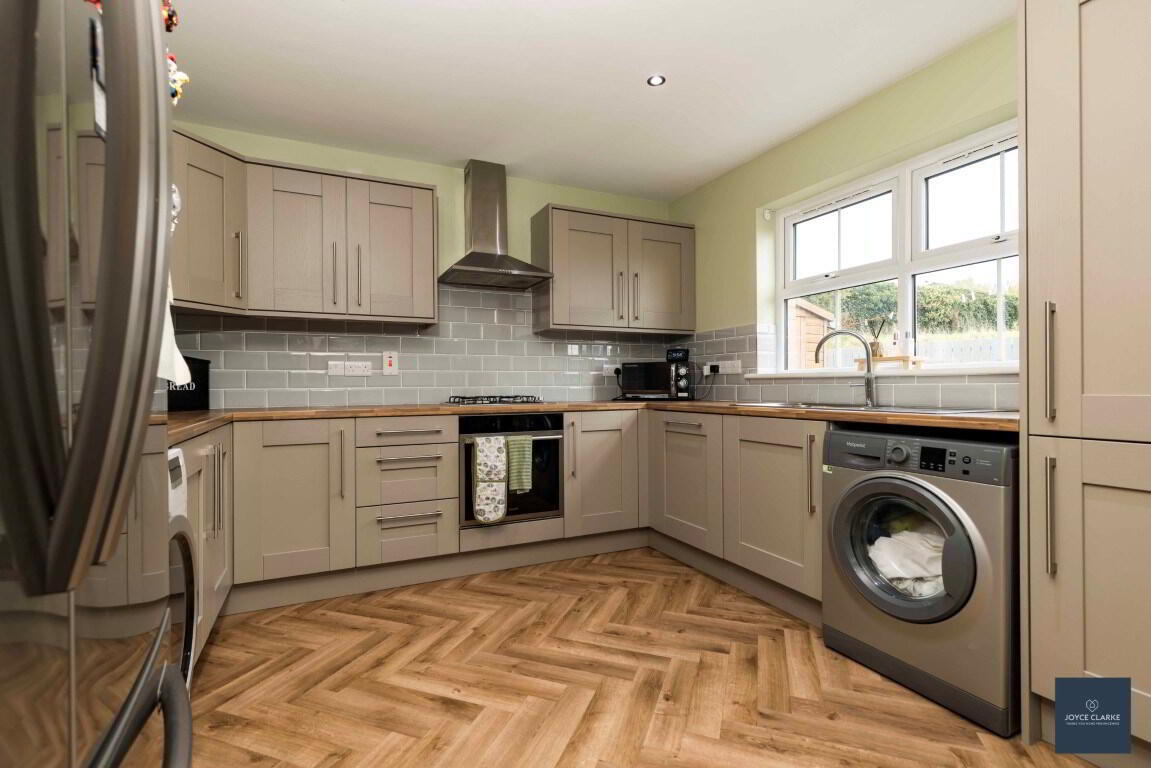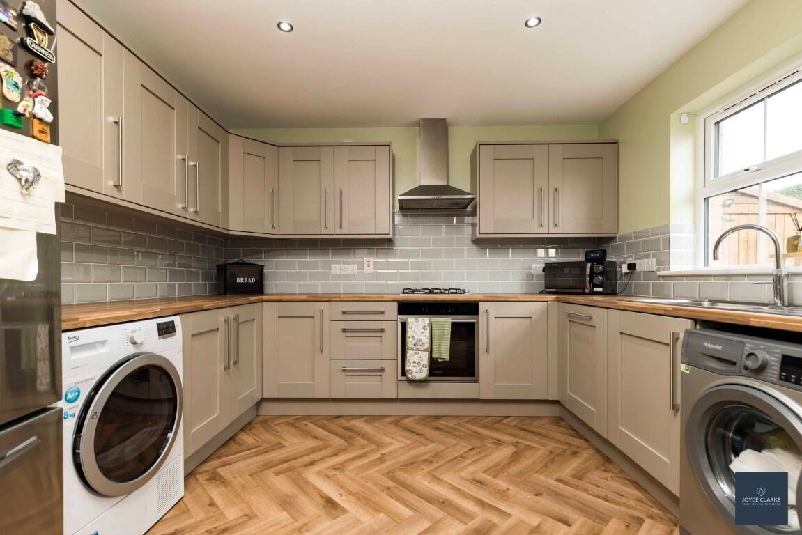 Excellent range of high and low level kitchen cabinets (2023). Range of appliances include electric oven, four ring gas hob with stainless steel extractor canopy above and integrated dishwasher. Gas boiler encased in cabinet. Space for American style fridge freezer, washing machine and tumble dryer. Stainless steel one and half bowl sink and drainage unit with mixer tap. Tiled splashback. Recessed lighting. Double panel radiator. Double UPVC framed patio doors leading to rear garden. Wood effect herringbone style LTV flooring.