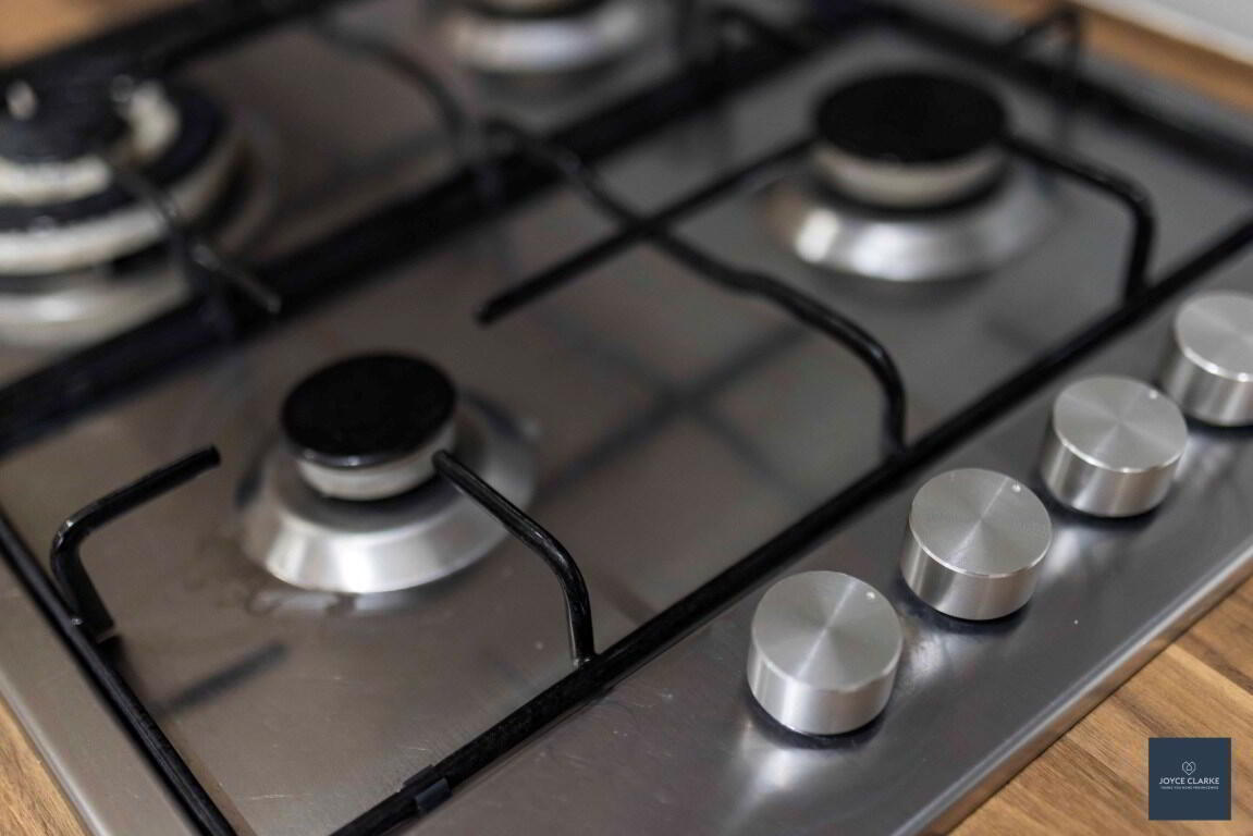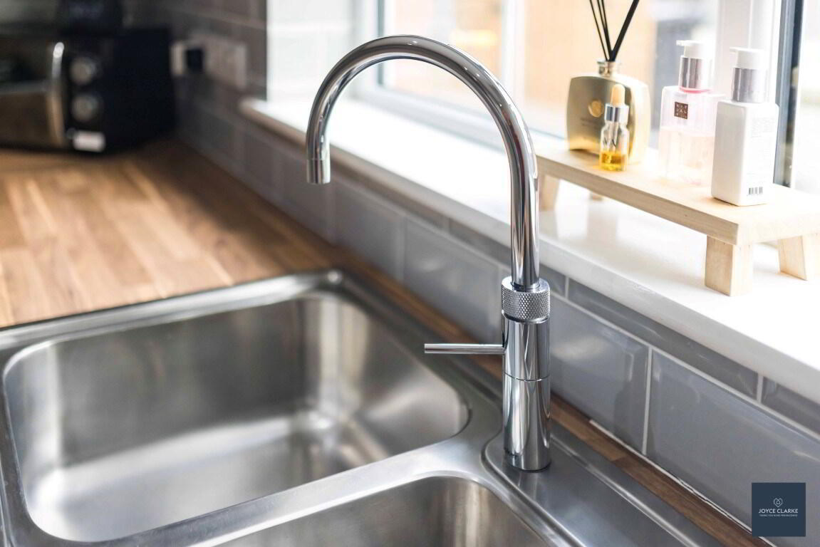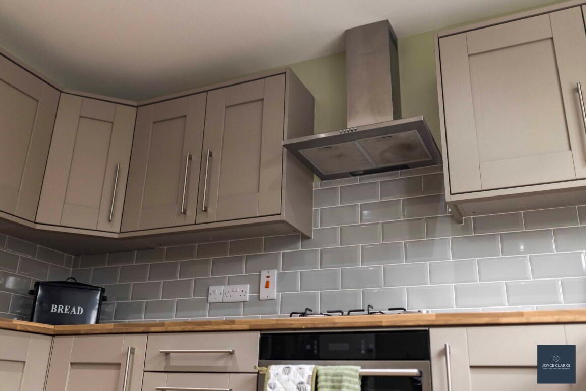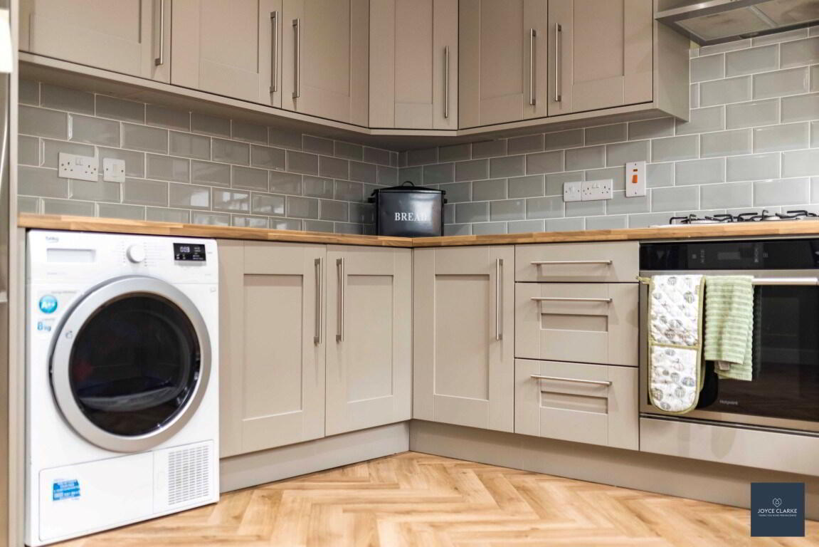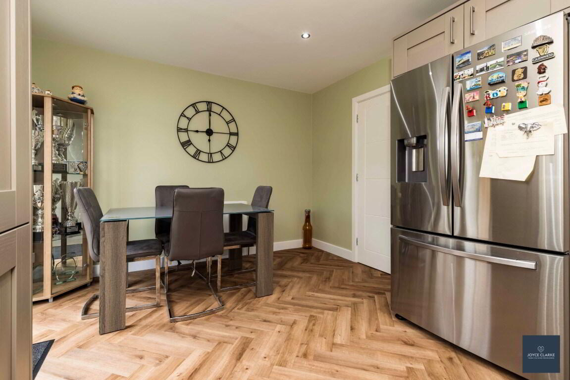 Excellent range of high and low level kitchen cabinets (2023). Range of appliances include electric oven, four ring gas hob with stainless steel extractor canopy above and integrated dishwasher. Gas boiler encased in cabinet. Space for American style fridge freezer, washing machine and tumble dryer. Stainless steel one and half bowl sink and drainage unit with mixer tap. Tiled splashback. Recessed lighting. Double panel radiator. Double UPVC framed patio doors leading to rear garden. Wood effect herringbone style LTV flooring.