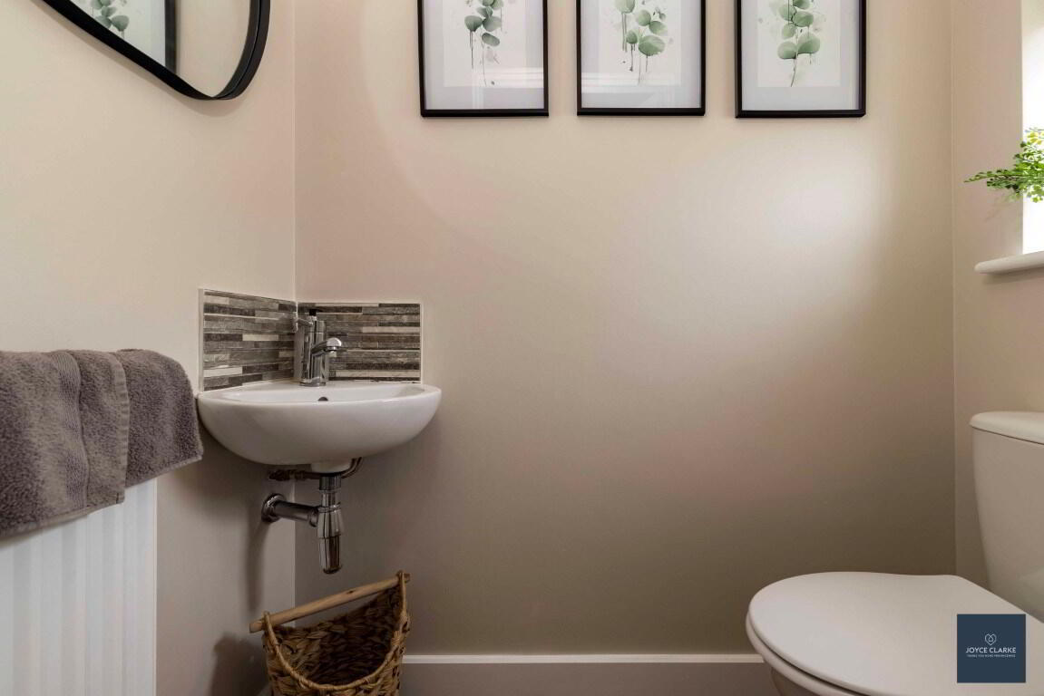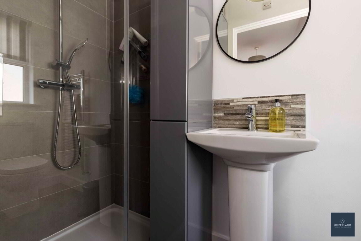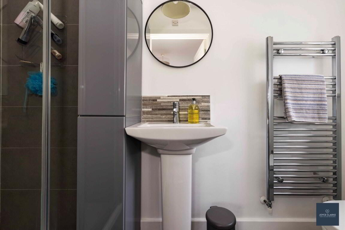 Tiled shower enclosure with mains fed shower including rainfall showerhead. Back to wall dual flush WC and wash hand basin with pedestal including tiled splashback. Heated towel rail. Extractor fan. Tile effect vinyl flooring.