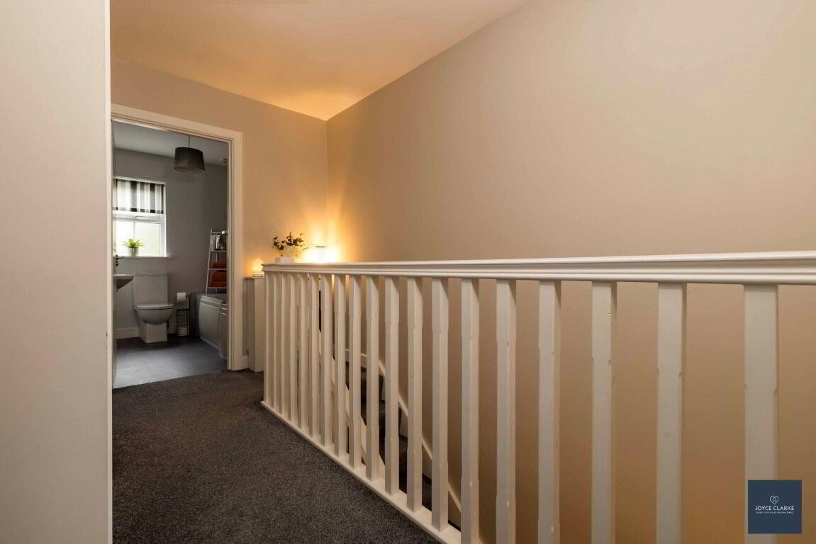 Front garden laid in lawn. Decorative paved pathway leading to front door and around side of property. Tarmac driveway to side providing off street parking.