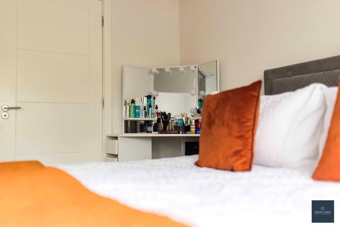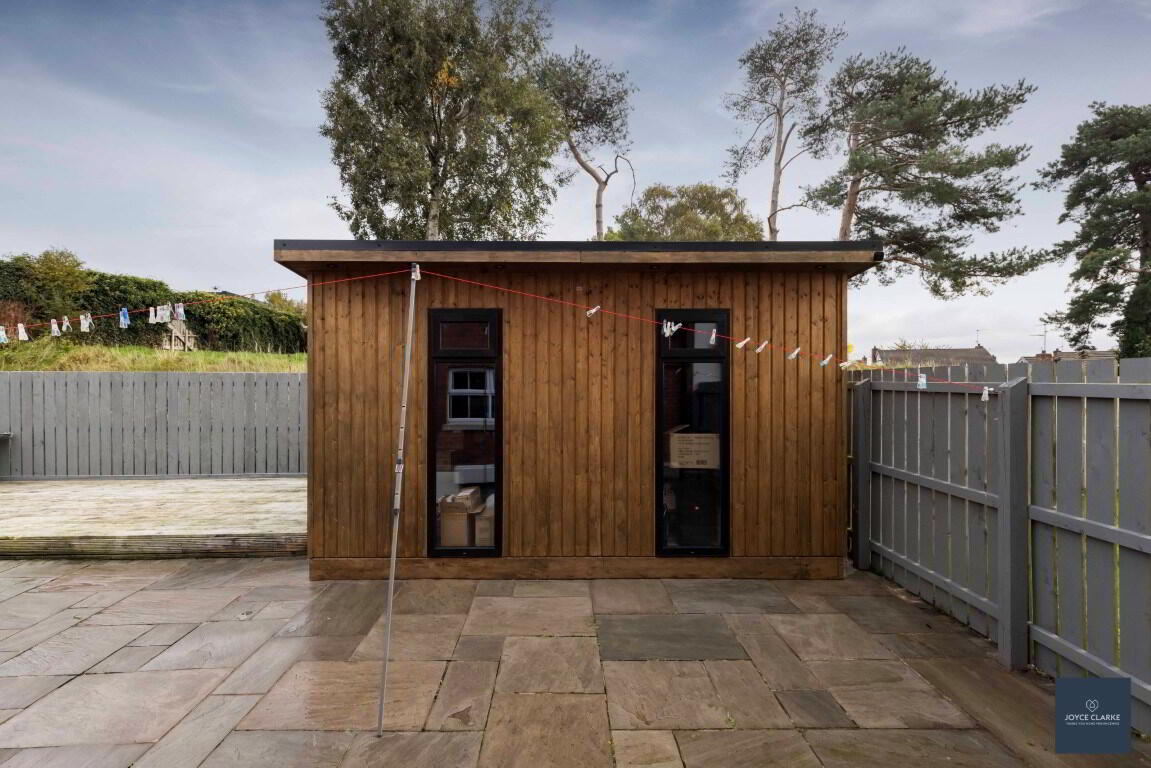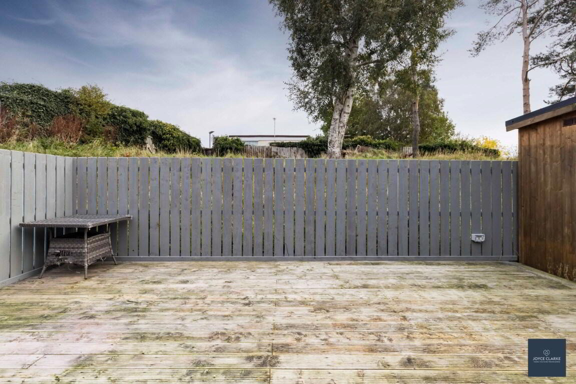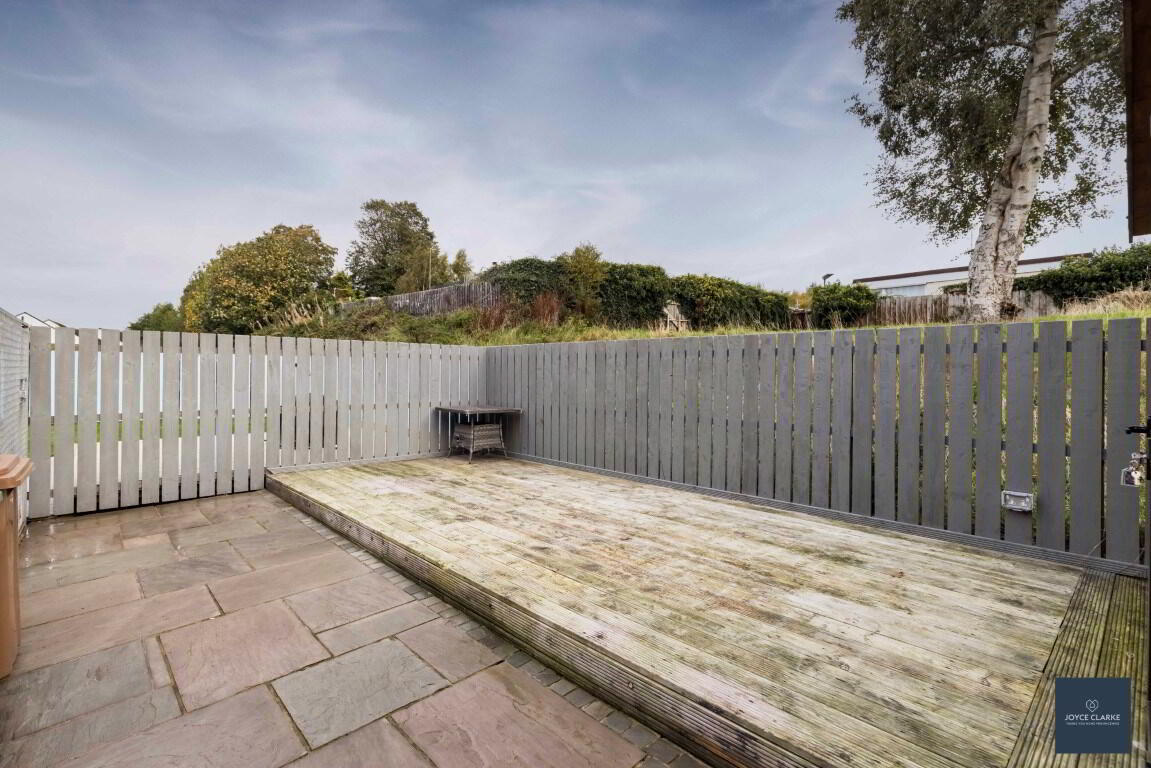 Fully enclosed private rear garden with gated access to side. Majority of garden laid in decorative paving with raised decked area. Outside powerpoint, tap and lighting. Garden shed.