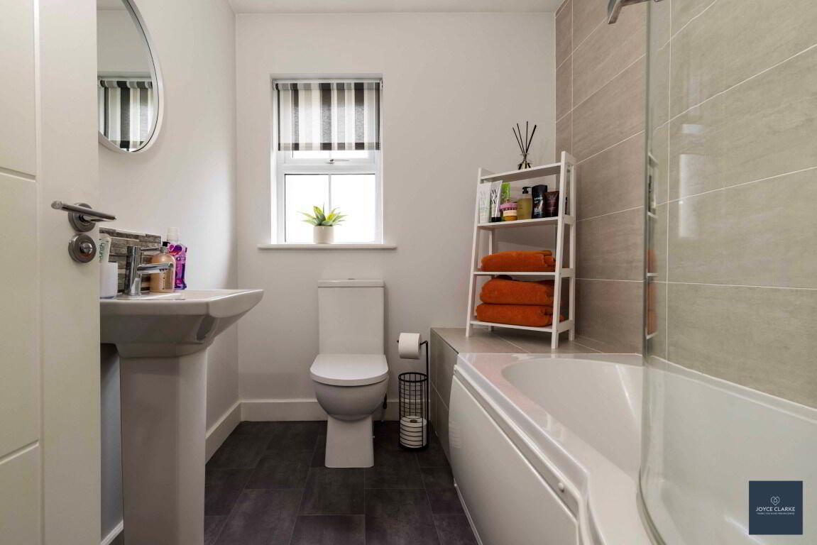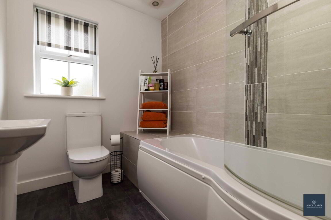 P shaped bath with feature wall tiling, showerhead attachment and shower screen above. Back to wall dual flush WC and wash hand basin with pedestal and tiled splashback. Heated towel rail. Tile effect vinyl flooring. Extractor fan.