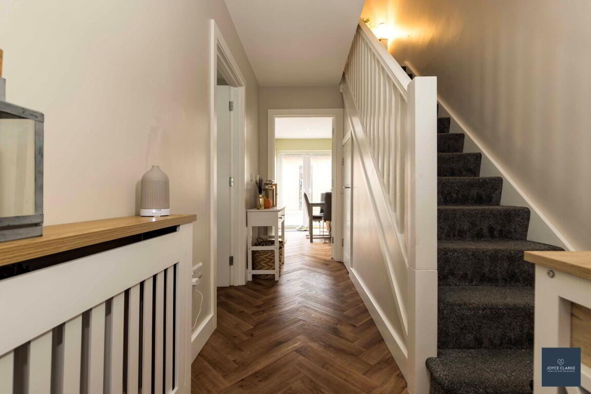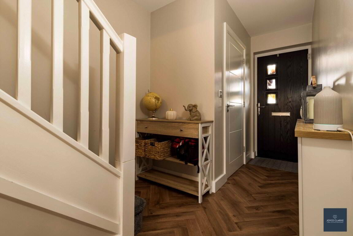 ENTRANCE HALLComposite entrance door with glazed panel. Single panel radiator. Wood effect herringbone style LVT flooring. Storage closet under stairs.