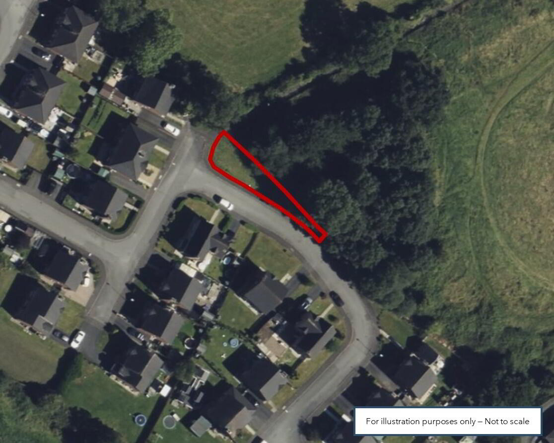 Front garden laid in lawn with paved pathway. Tarmac driveway to side providing off street parking. Property includes additional land on other side of road.