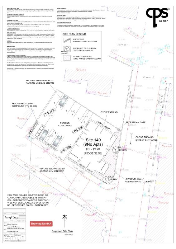 The site, immediate south west of 138 Thomas Street, will also include a gated courtyard accessed from Coronation Street with nine car parking spaces, cycle parking spaces, a single-storey refuse and recycling compound, and associated site works.