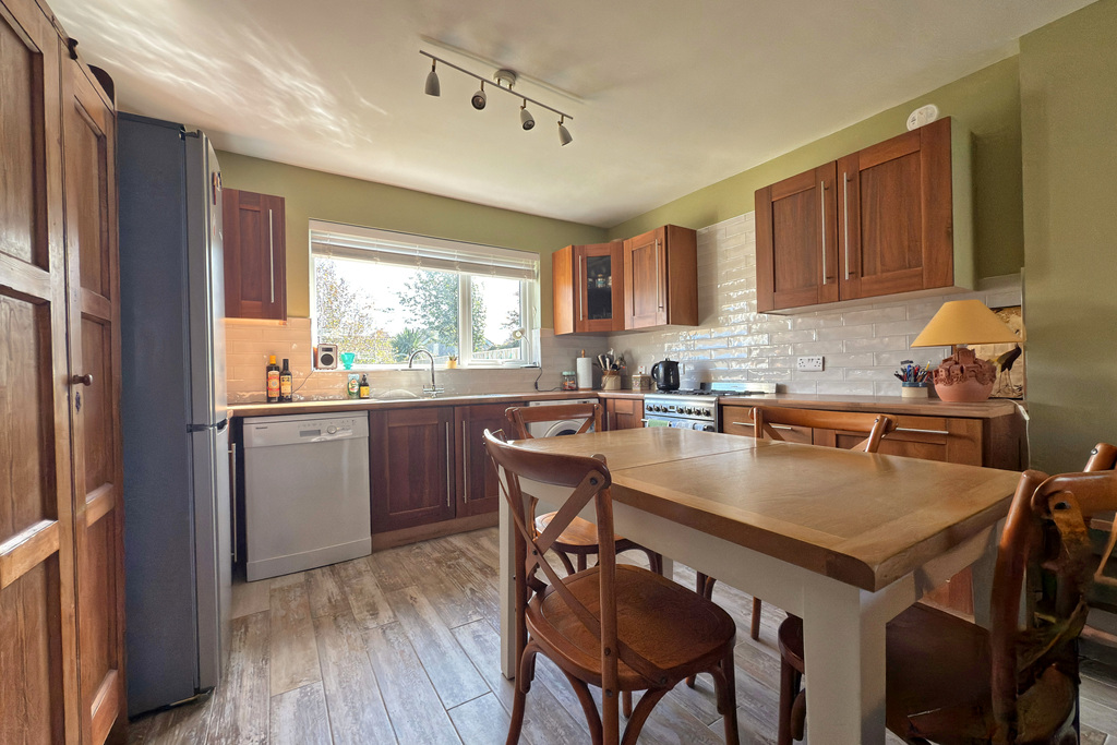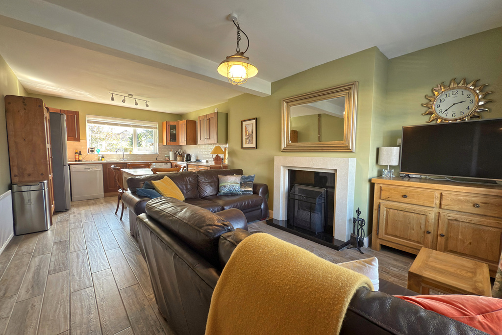 Range of high and low level units; laminate work surfaces; stainless steel sink unit; space for cooker and fridge freezer; plumbed for washing machine and dishwasher; wood effect tiled floor; open plan to living area.