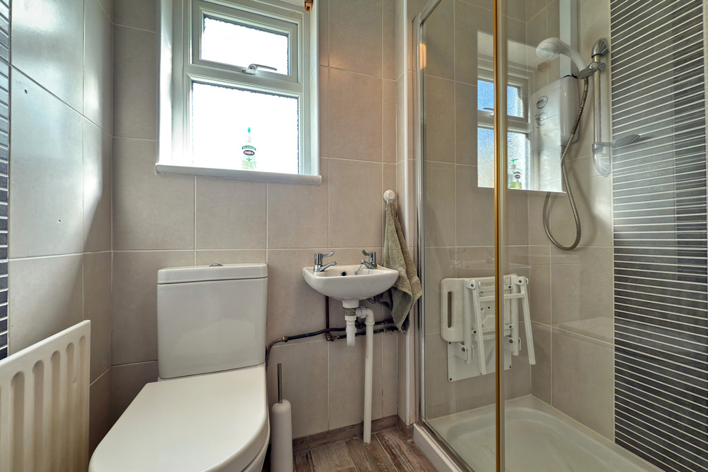 Tiled shower cubicle with electric shower; low flush WC; wash hand basin; tiled walls and tiled flooring.
