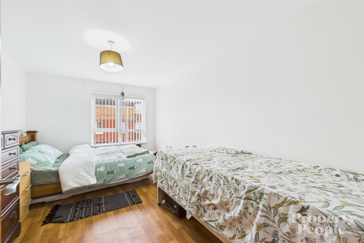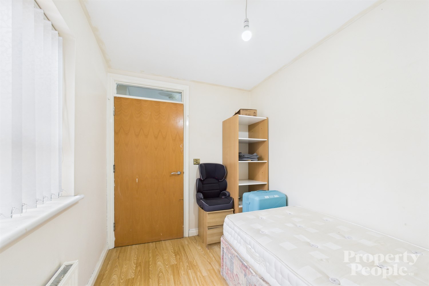 A bright second bedroom with lino wooden effect floor and panelled radiator.