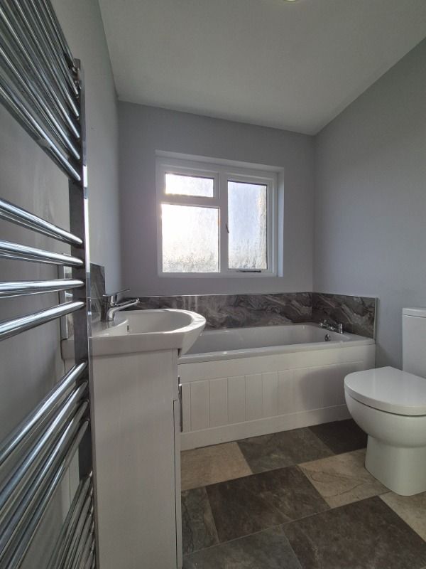 White suite comprising low flush w.c, basin, vanity unit and panelled bath. Separate electric corner shower. Wall mounted heated towel rail.