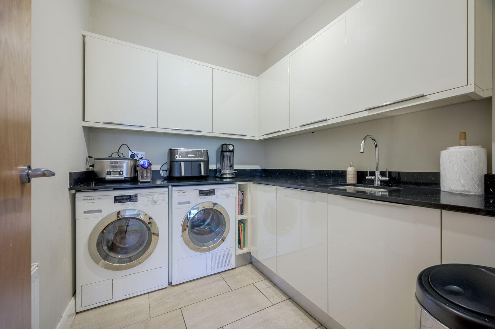 With range of white high gloss high and low level units, black granite worktop, stainless steel basin and a half undermount sink unit, waste disposal, chrome mixer taps, hot water tap, Siemens built-in double oven, Miele integrated dishwasher, American fridge freezer space, peninsula unit with additional storage and breakfast bar, Siemens integrated induction hob, Siemens stainless steel extractor fan, recessed spotlights, ceramic tiled floor.