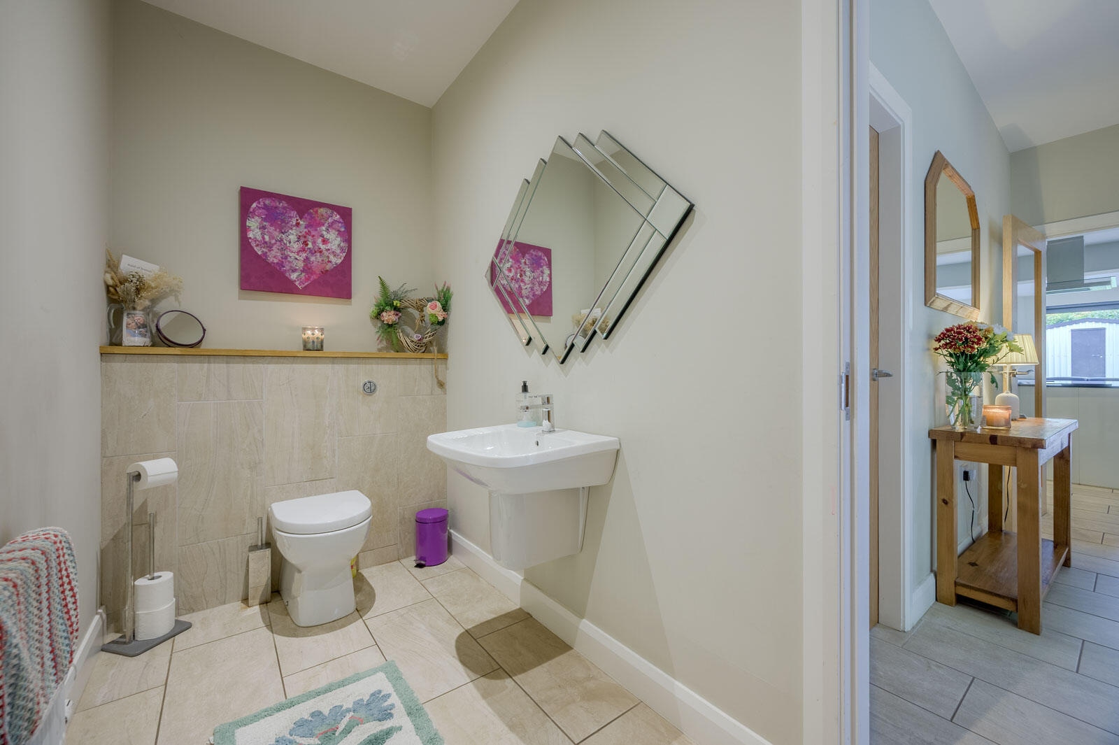 With white suite comprising fully tiled shower cubicle, thermostatic shower, semi pedestal wash hand basin, wall mounted WC, tiled floor, Velux window, chrome heated towel rail.