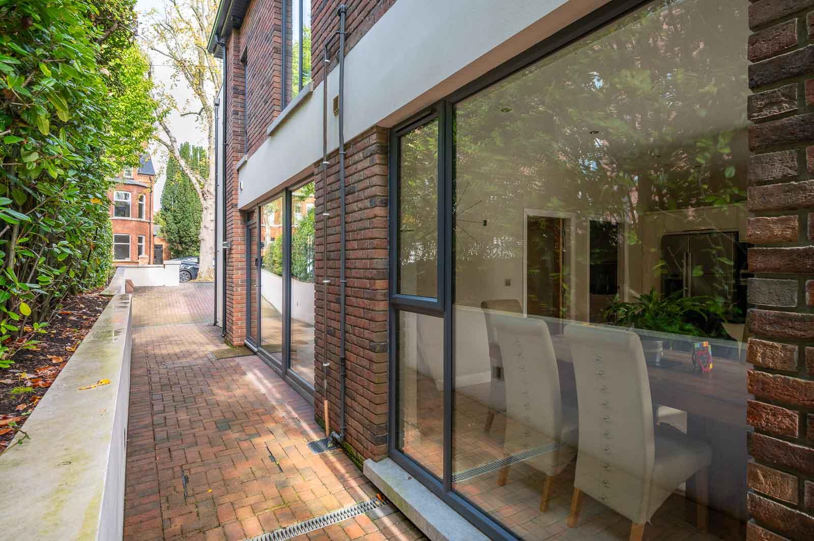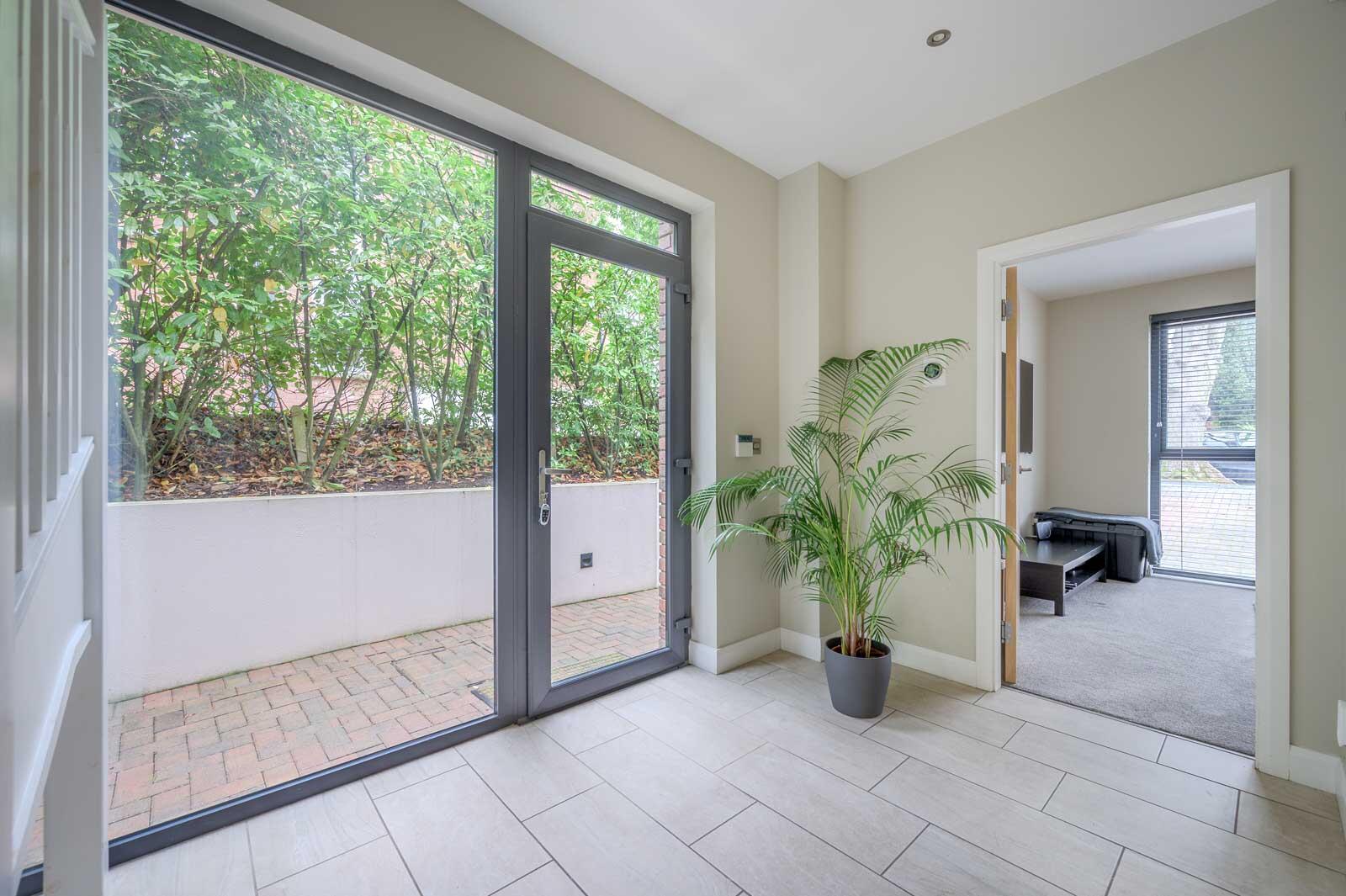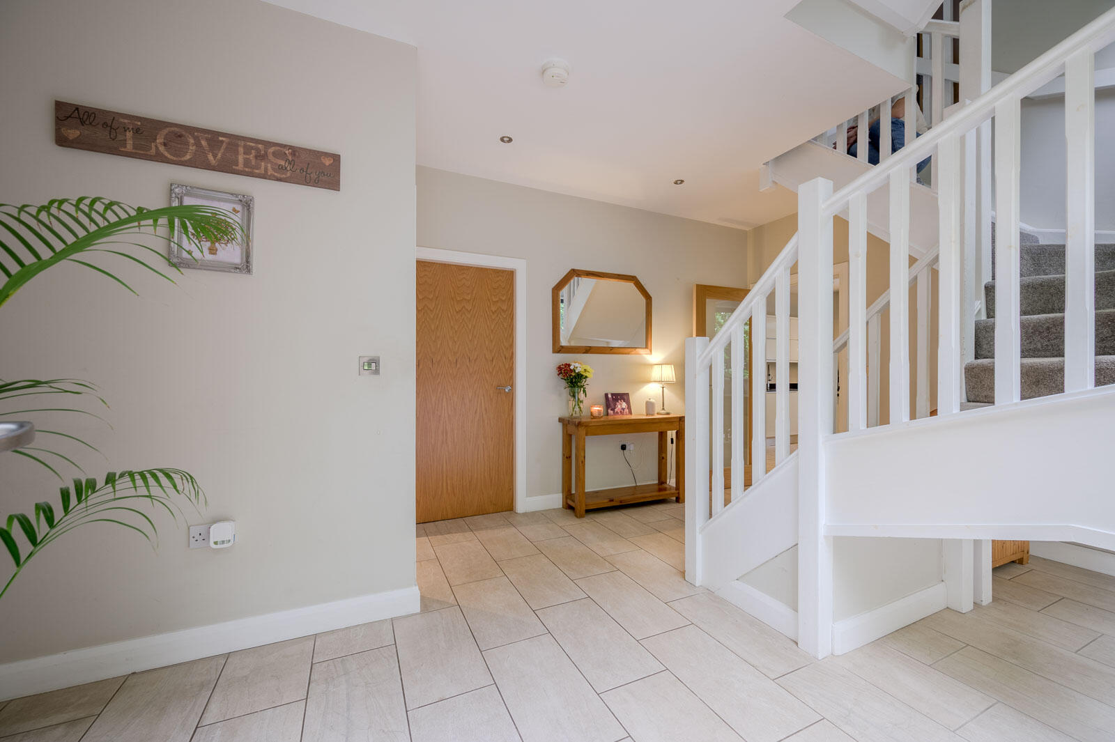 Brick paved pathway to side leading to aluminium double-glazed door with full length glass panels to side and top light into bright spacious entrance hall.