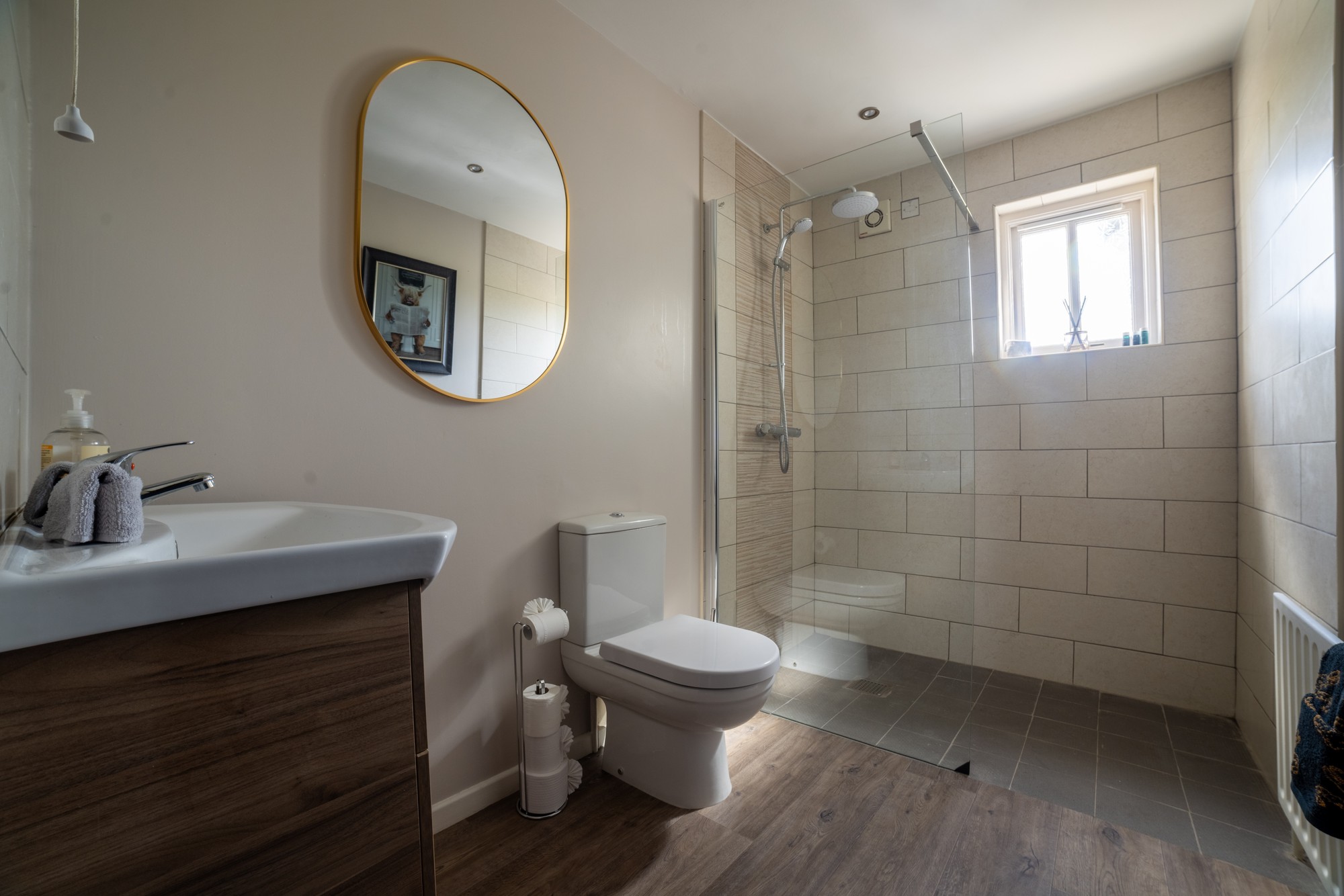 Tiled floor & splash back, white suite including step in shower with electric shower, recessed lighting, laminated floor