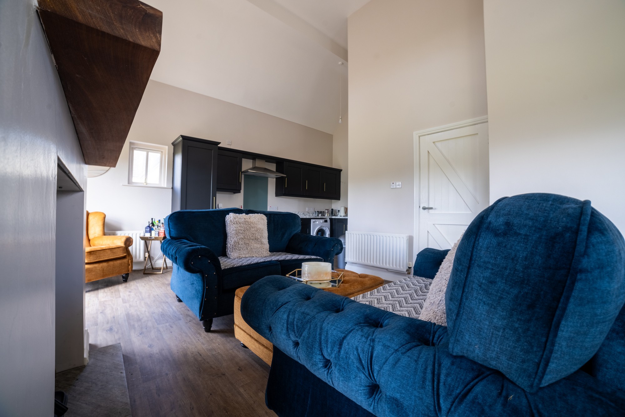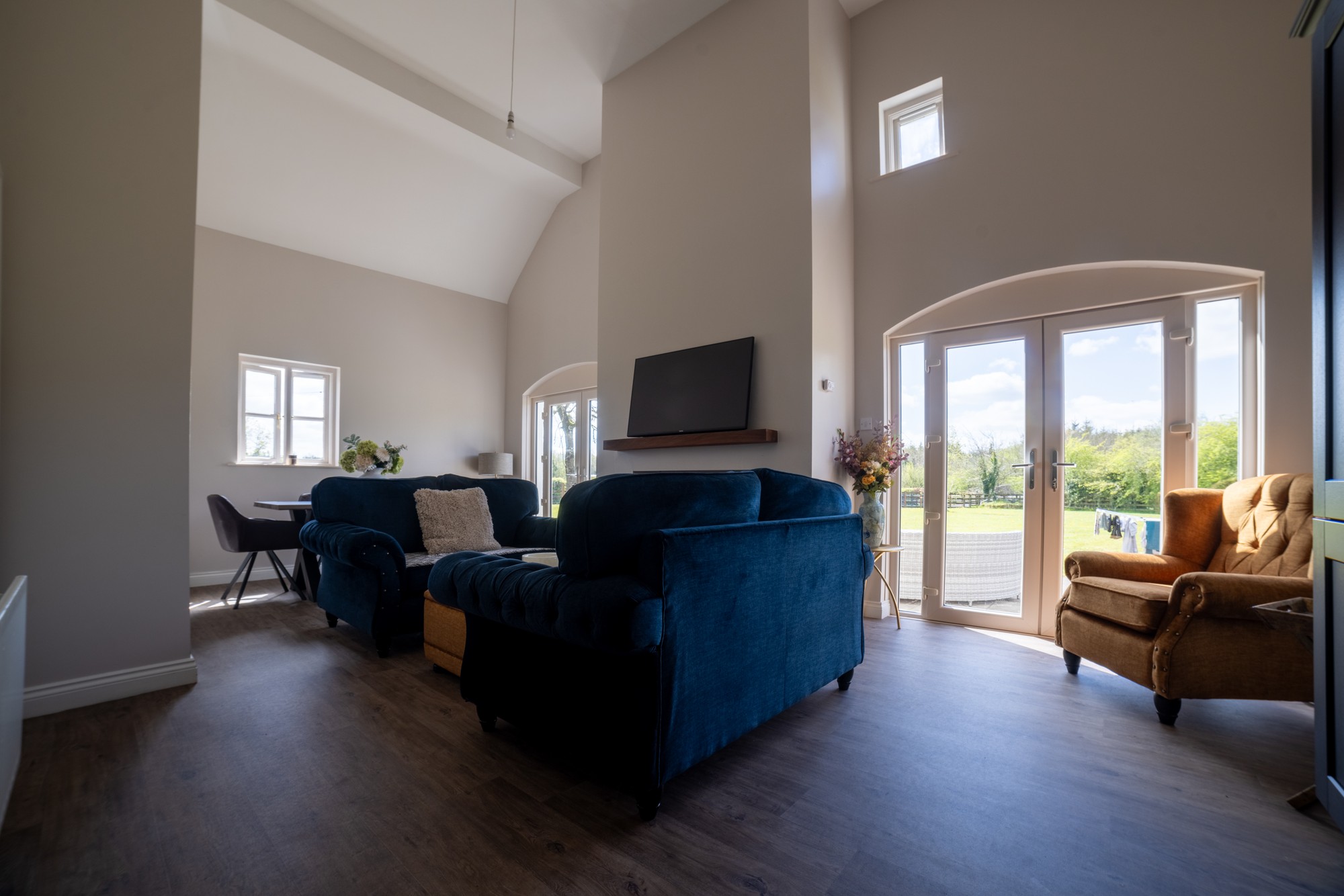 High ceiling and window feature, solid fuel stove, 2 no. double patio doors looking onto paved patio area. Fully fitted bespoke kitchen with integrated hob, oven and grill, fridge freezer and dishwasher, clay tiled floor.