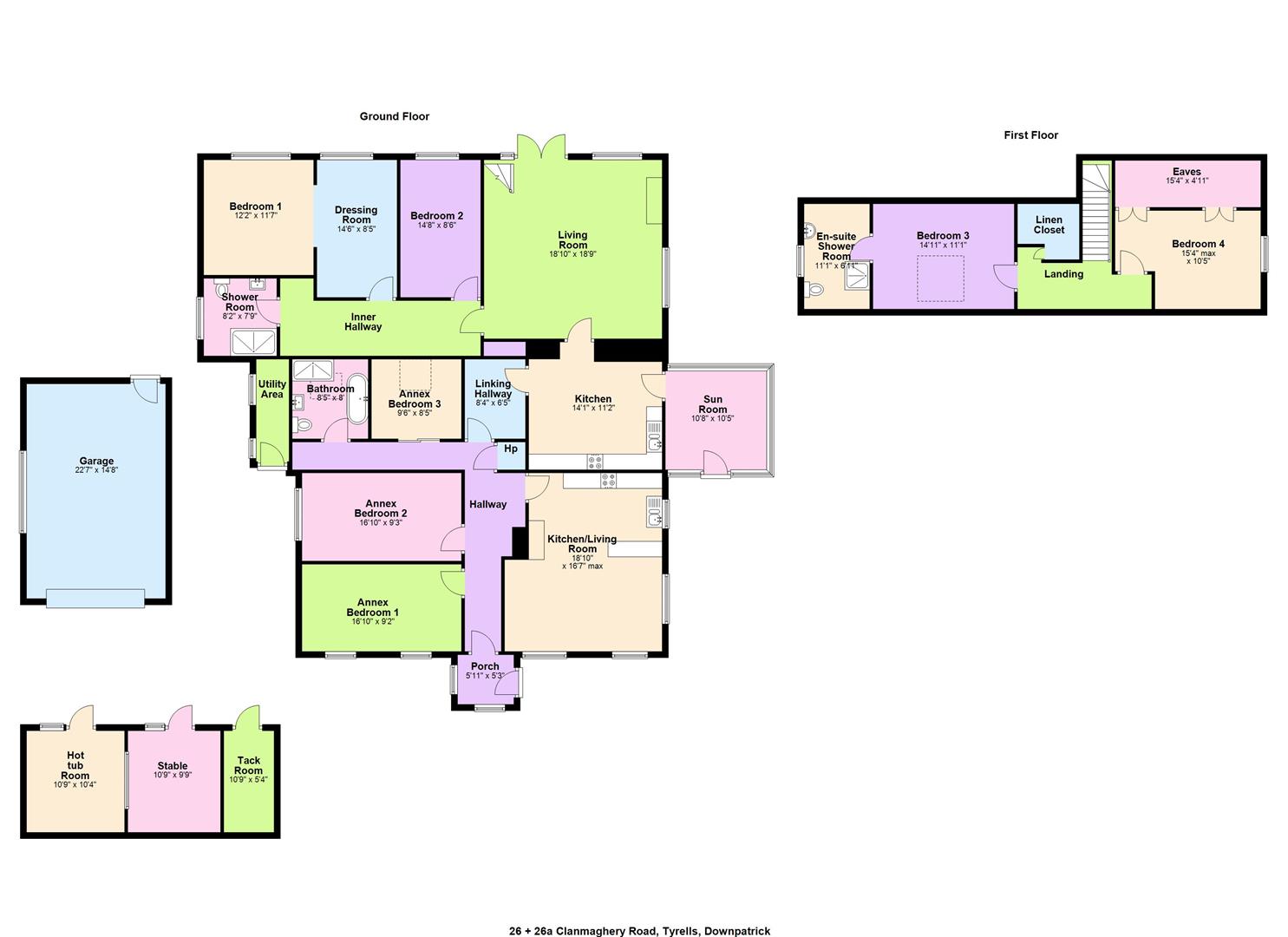 The main home comprises to the ground floor double aspect lounge with multi fuel stove, sun room, kitchen with dining area, shower room, double bedroom and principle bedroom with dressing room, while the first floor boasts a further two sizeable bedrooms, one with en-suite facilities. The property is further enhanced with a linking hallway to ground floor annex, comprising three bedrooms, bathroom, and open plan double aspect lounge and kitchen.