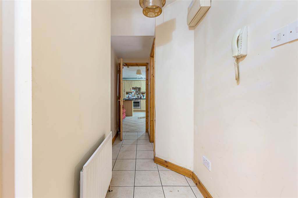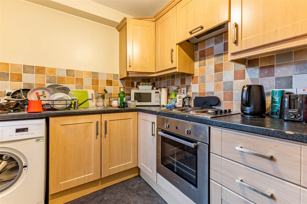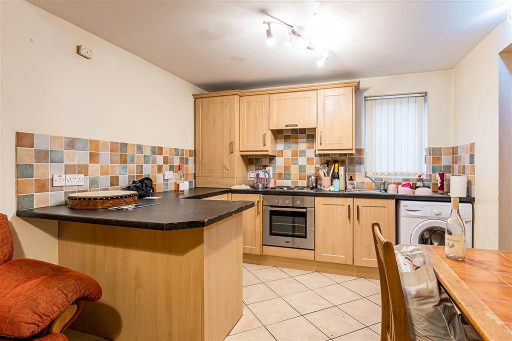 Open plan kitchen and living space with fire escape access to rear. Range of high and low level units with laminate work-surfaces, stainless steel sink and drainer, oven with ceramic hob and freestanding fridge.