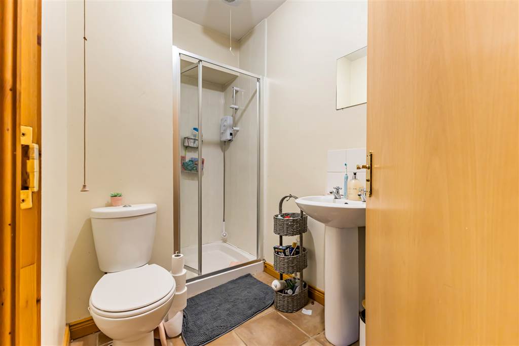 Three piece suite with corner Redring electric shower with sliding door, wash hand basin, low flush W/C and extractor fan. Tiled flooring.