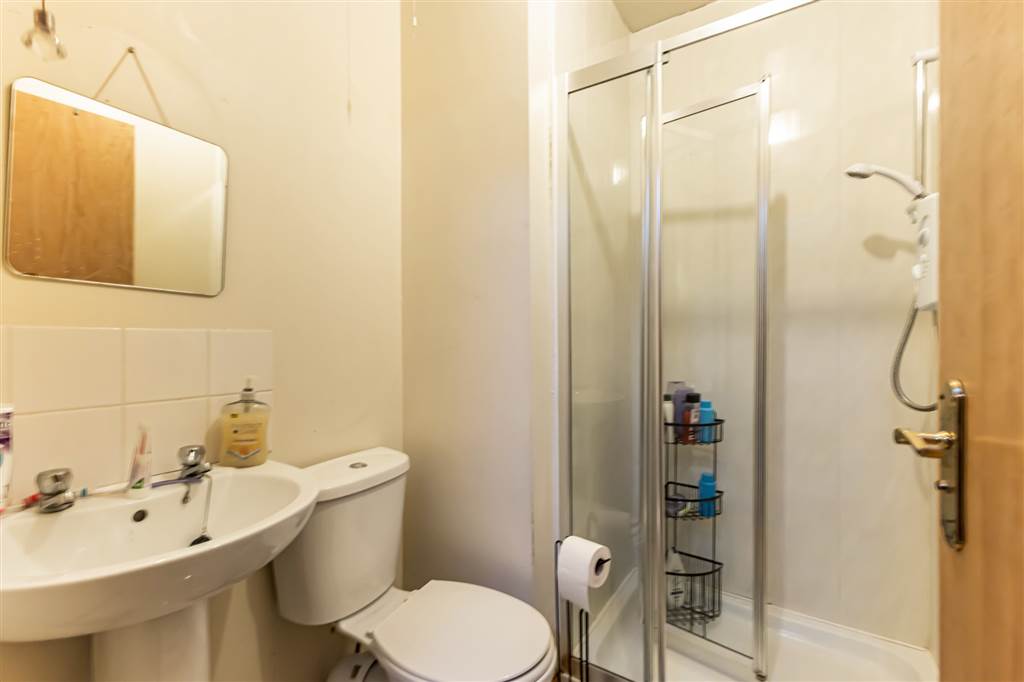 Three piece suite with corner shower with sliding door, wash hand basin, low flush W/C and extractor fan.
