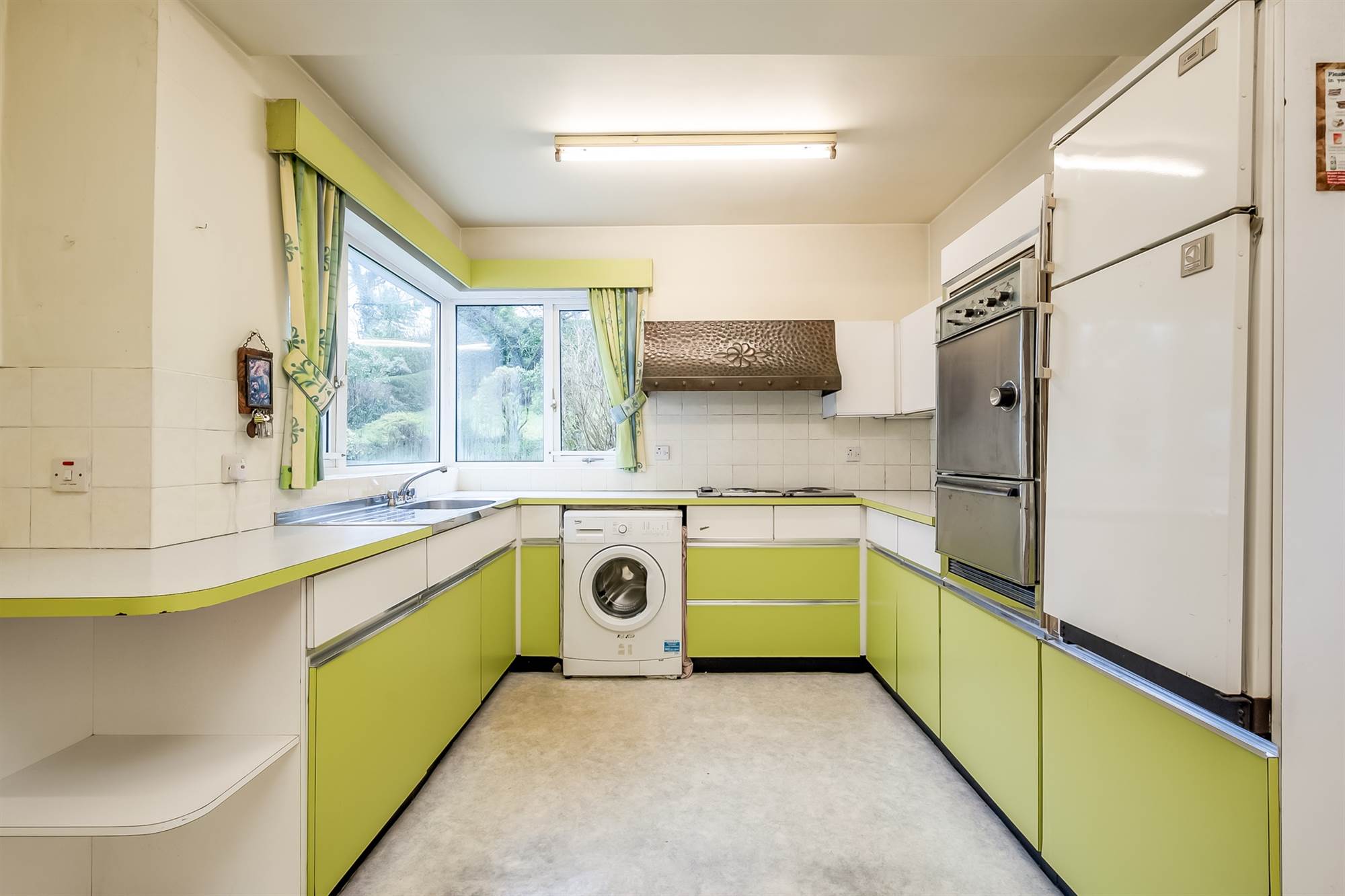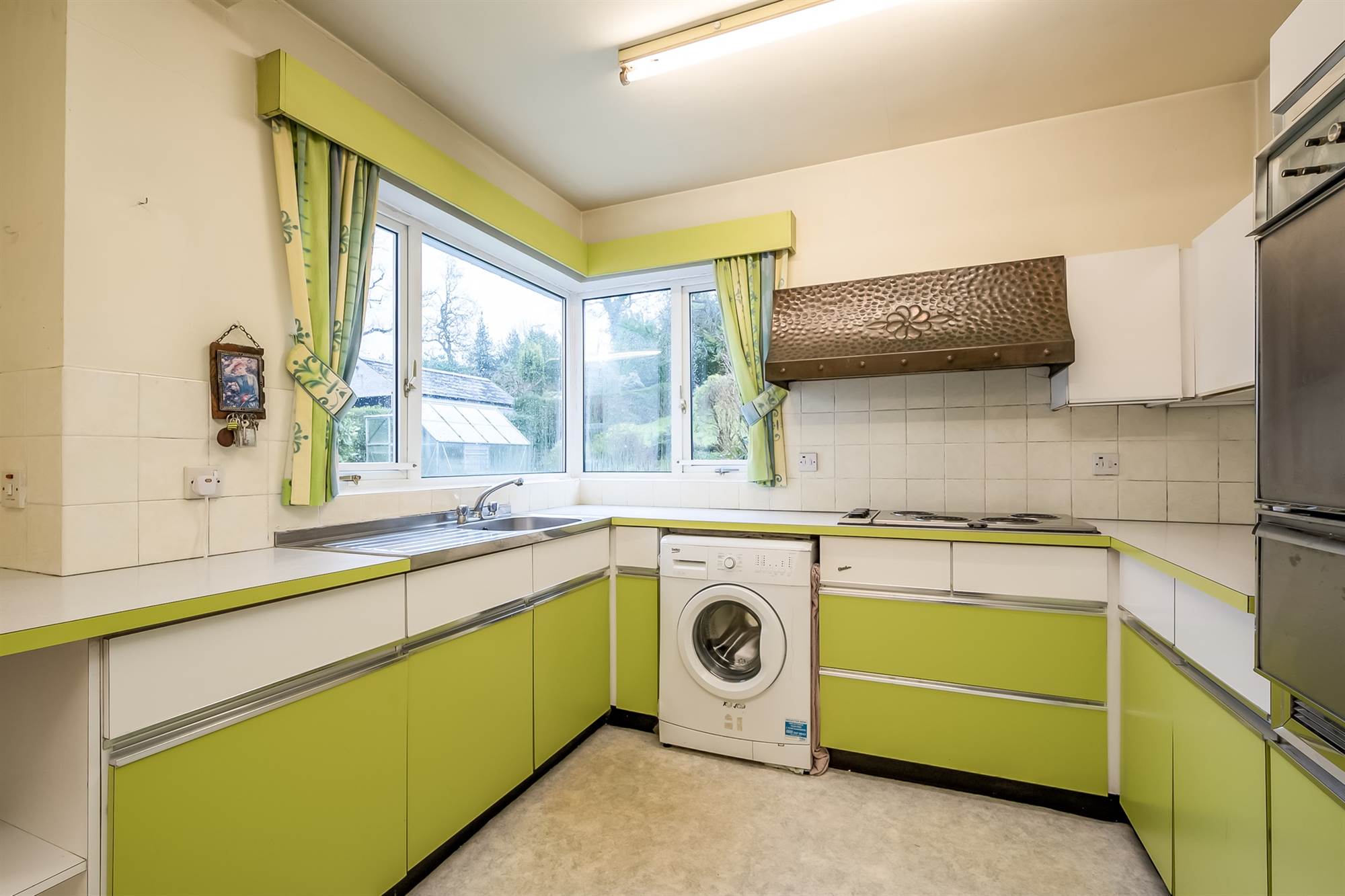 FITTED KITCHEN AND DINING AREA: 14' 5" X 10' 9" (4.39m X 3.28m) Range of high and low level units, work surfaces, single drainer stainless steel sink unit, four ring hob, oven, space for fridge/freezer, plumbed for washing machine. Part tiled walls. Door to rear.