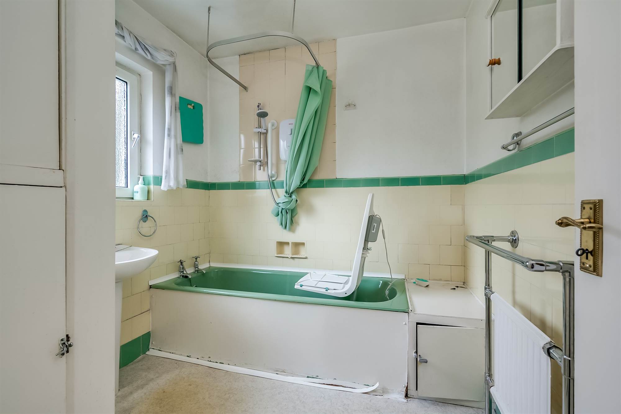 BATHROOM: Green suite comprising panelled bath with electric shower, white pedestal wash hand basin, part tiled walls, shelved airing cupboard.