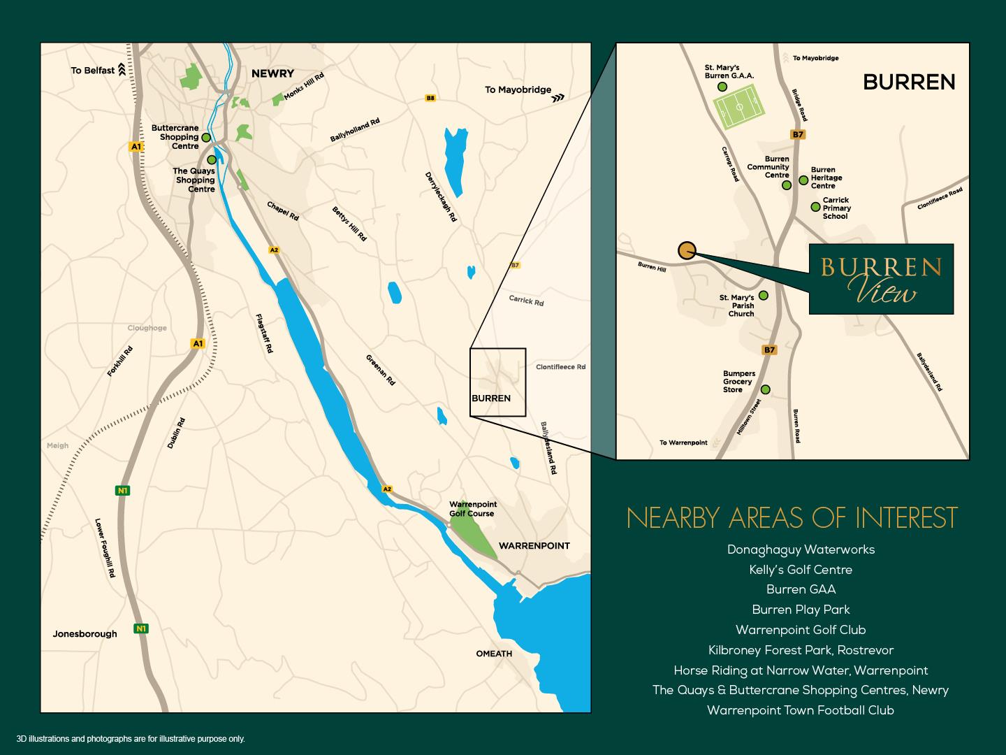 Burren View offers sixteen beautifully designed family homes designed for modern day family living. This prestigious development is situated in the heart of the highly sought after village of Burren and within close proximity to the seaside haven of Warrenpoint and bustling city of Newry. With community at the very heart of the village, Burren View is within walking distance to the local primary school, shop and community hub. Excellent transport links provide easy access to a wider network of schools and amenities, as well as the A1/M1 dual carriageway between Belfast and Dublin being less than 10 minutes away. The perfect place for you and your family to grow - Burren View.