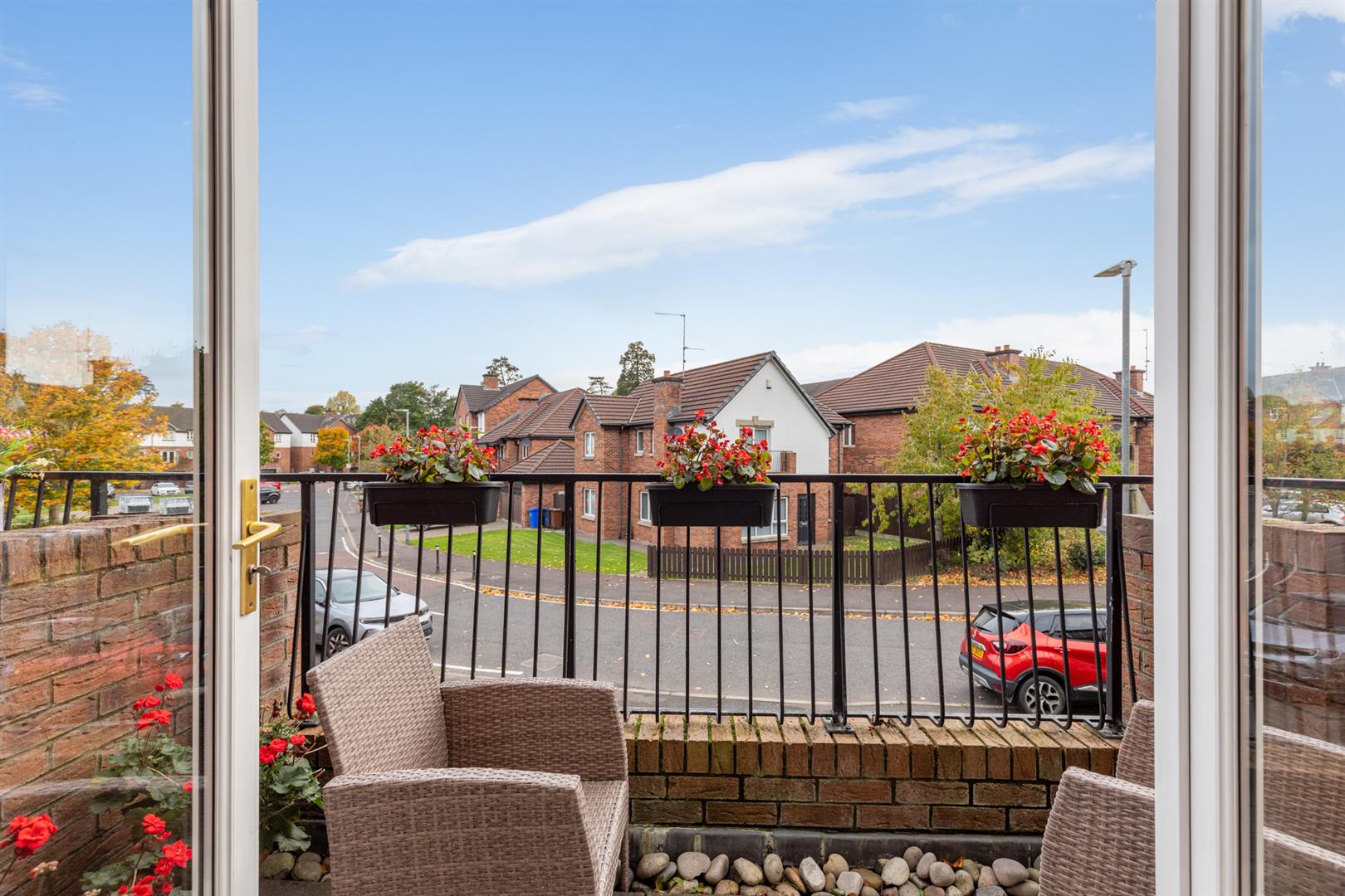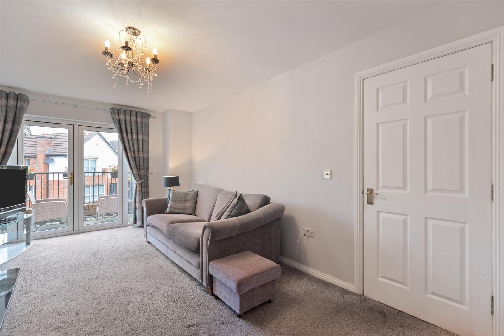 Feature fireplace with inset and hearth, double doors to south facing balcony, double doors to;