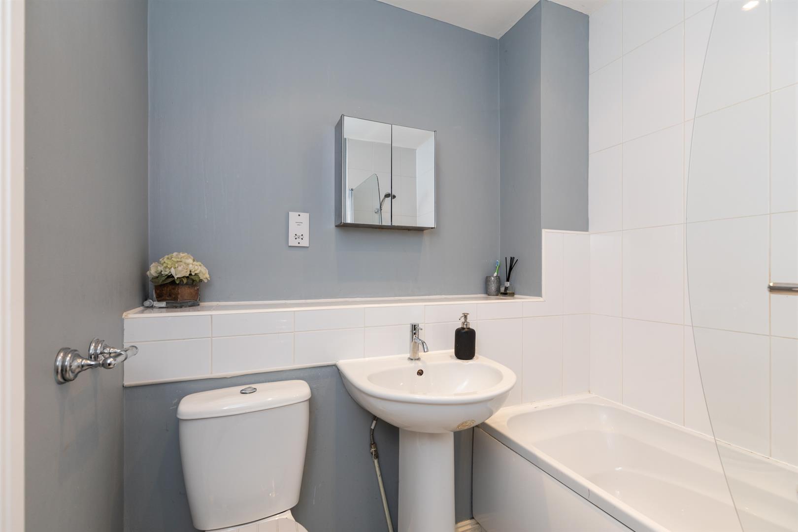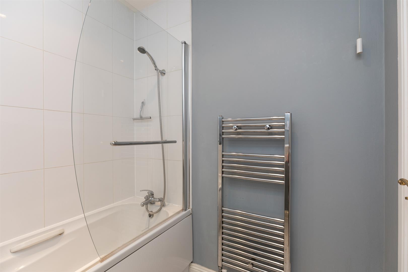 Panelled bath, telephone hand shower, low flush w.c, shower screen, tiling, pedestal wash hand basin, chrome effect sanitary ware, heated towel rail.