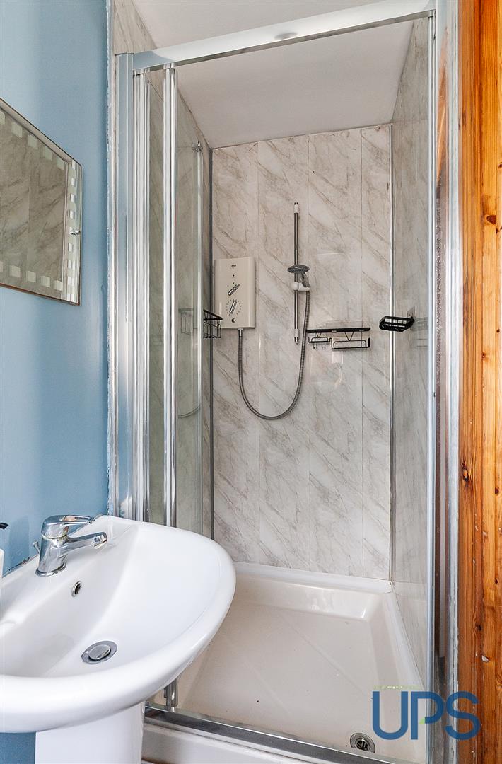 ENSUITE SHOWER ROOM Shower cubicle, electric shower unit, low flush w.c, pedestal wash hand basin, extractor fan.