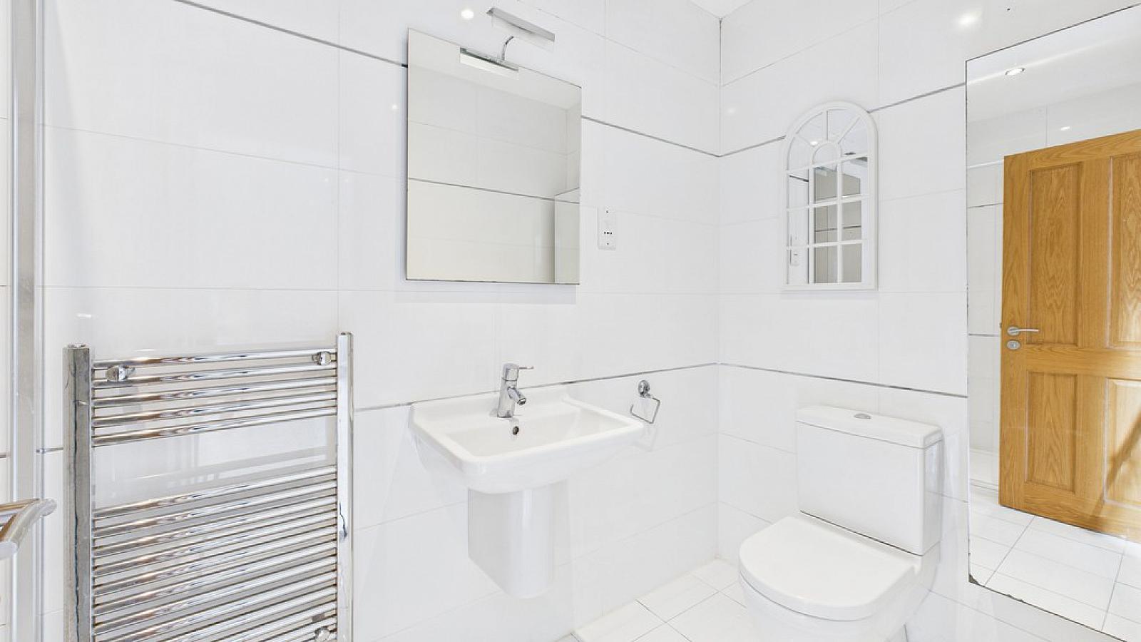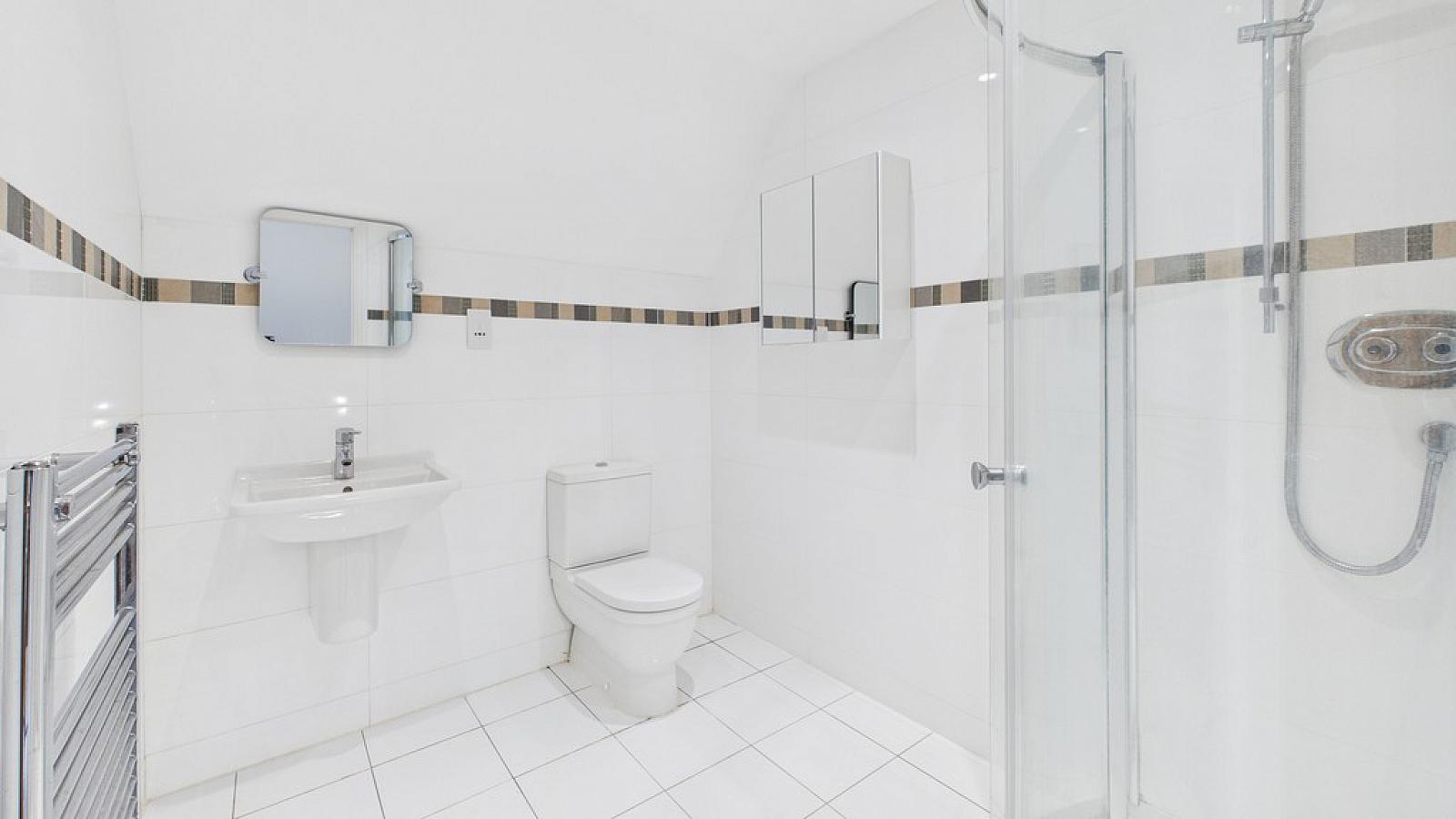 EN SUITE SHOWER ROOM Suite comprising shower enclosure with thermostatic shower; dual flush WC; free-standing wash hand basin; heated towel rail; tile floor.
